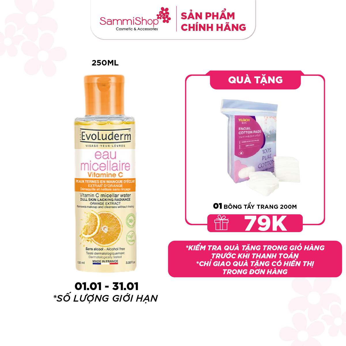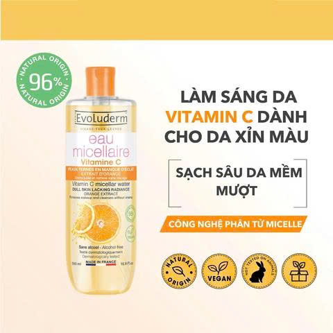 Evoluderm Nước tẩy trang Vitamin C với 96% thành phần nguồn gốc tự nhiên, thuần chay, giàu vitamin C và chiết xuất cam giúp thanh lọc da, loại bỏ bụi bẩn và tạp chất ô nhiễm một cách nhẹ nhàng mà không gây khô căng. Vitamin C và chiết xuất cam mang lại khả năng chống oxy hóa, dưỡng ẩm, làm mềm da và khôi phục vẻ rạng rỡ. Kết hợp cùng glycerin thực vật giúp cấp ẩm, bảo vệ da, để lại làn da sạch thoáng, tươi mới và tràn đầy sức sống.