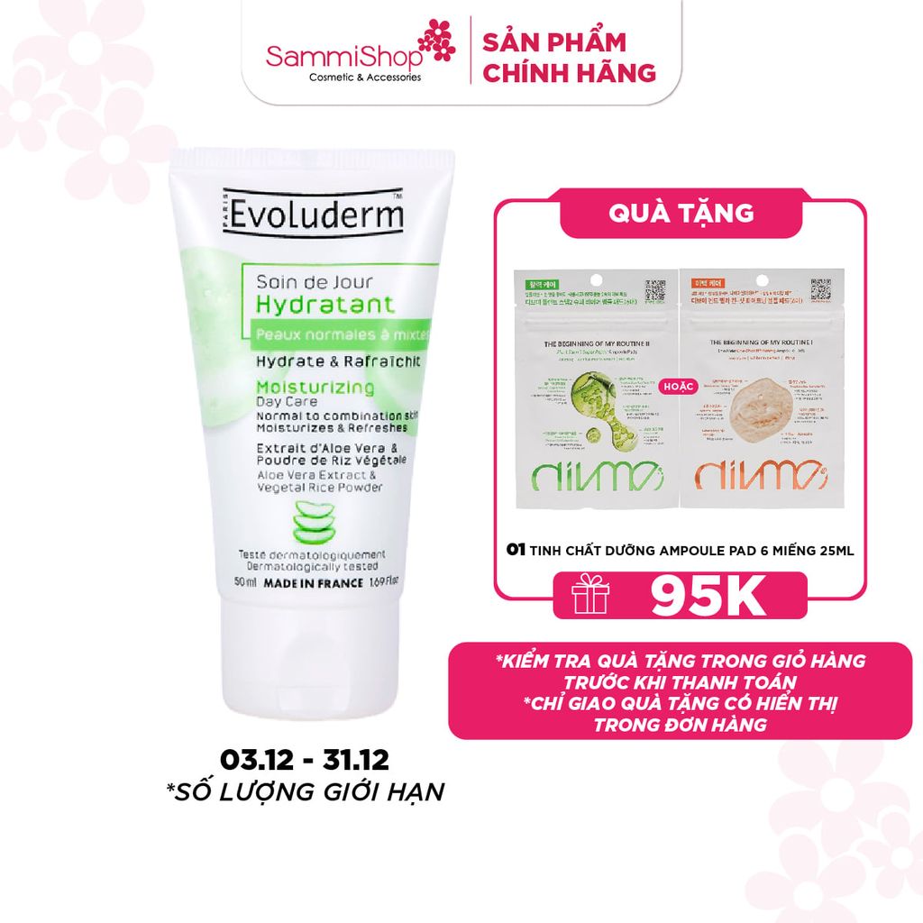 Evoluderm Kem dưỡng ẩm ban ngày Moisturizing Day Care 50ml giúp giảm lượng dầu tiết ra trên da, giúp làm mềm da nhưng không gây bết dính khi sử dụng