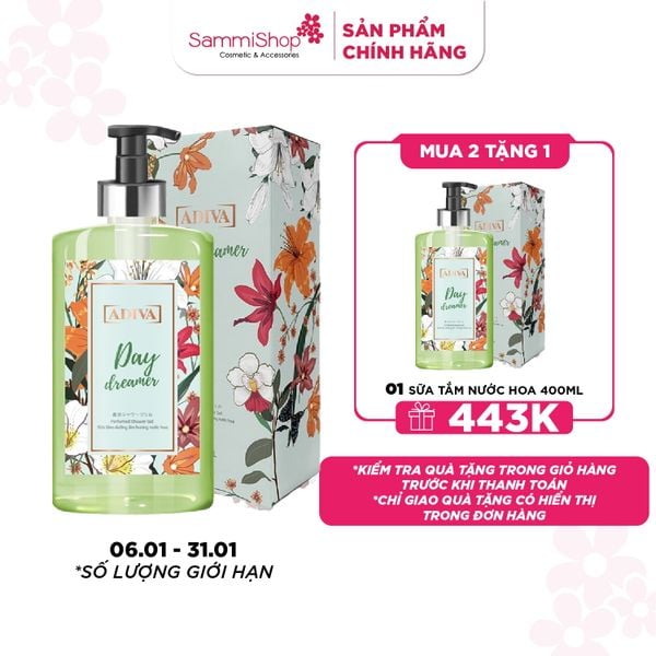 - Sữa tắm dưỡng ẩm hương nước hoa ADIVA Day Dreamer có 3 tầng hương đầy lôi cuốn tạo nên một hành trình chuyển đổi cảm xúc đầy mộng mơ, quyến rũ & sâu sắc đến khó tả: