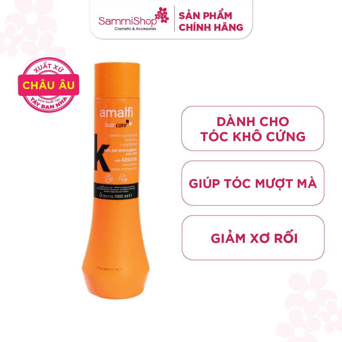 Amalfi Dầu xả Anti-frizz Conditioner with Keratin 1000ml giúp Dưỡng tóc suôn mượt, óng ả với Keratin. Ngoài ra, dầu xả còn cân bằng pH cho da đầu, giúp tránh kích ứng.
