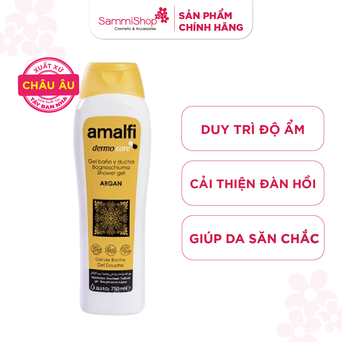 Amalfi Gel tắm Argan Shower Gel 750ml với chất dưỡng ẩm tự nhiên, giúp duy trì độ ẩm cho da, ngăn ngừa tình trạng khô da và bong tróc.