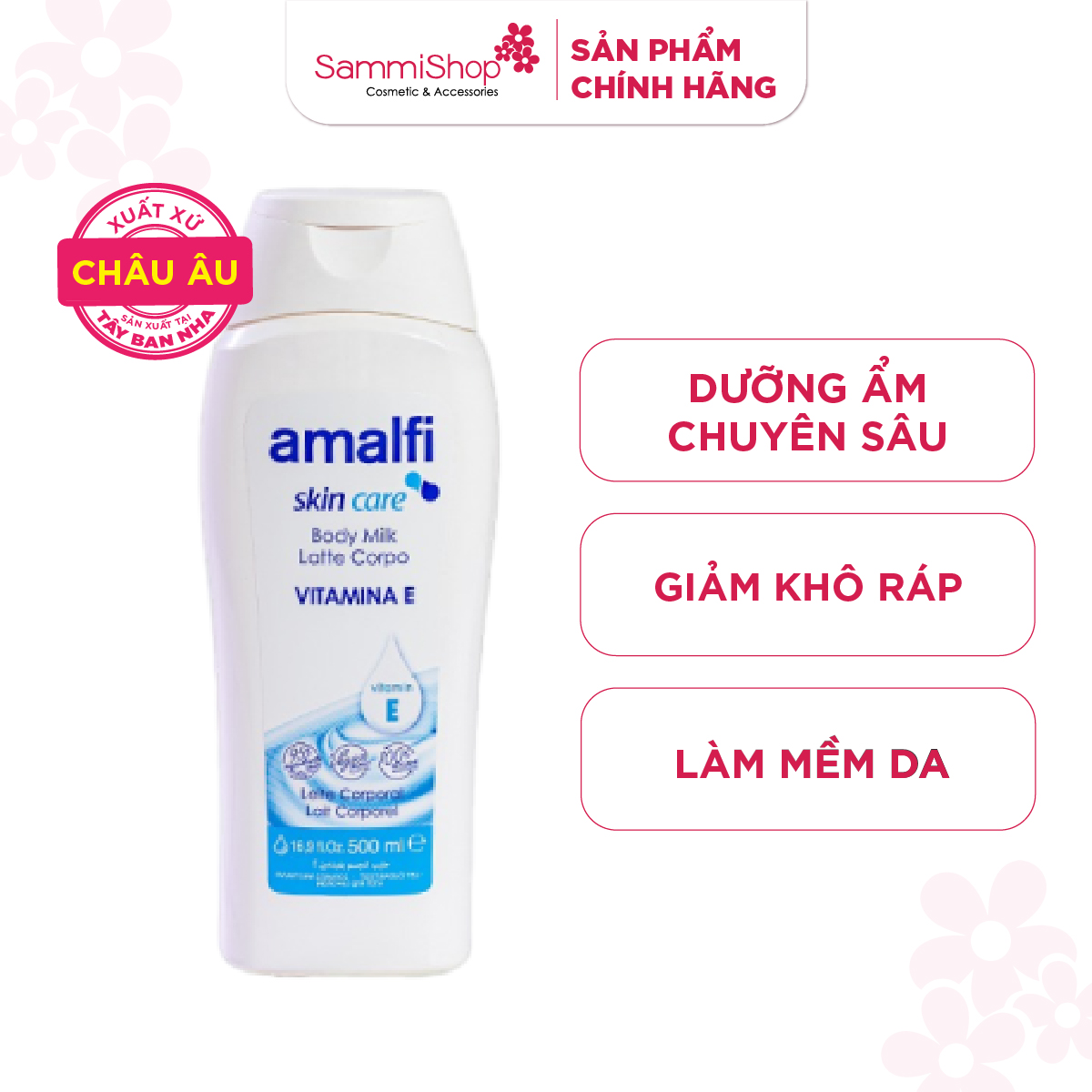 Amalfi Sữa dưỡng thể Vitamin E Body Milk 500ml giúp bổ sung vitamin, dưỡng ẩm chuyên sâu, chống lại các gốc tự do và bảo vệ da khỏi sự tổn thương do môi trường, dưỡng ẩm và làm mềm da.