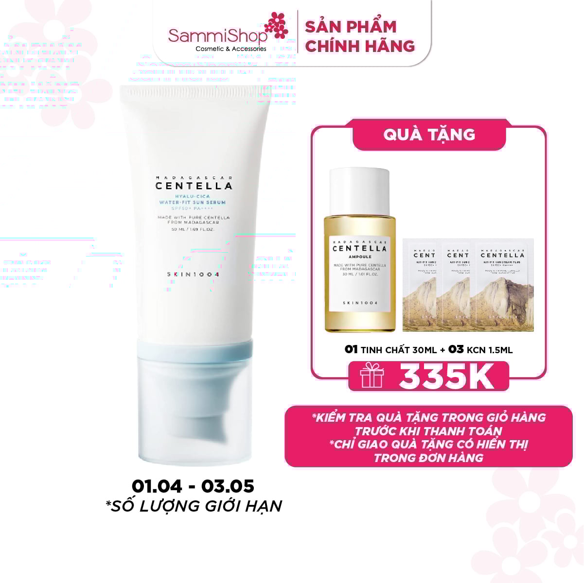 Tinh chất chống nắng Skin1004 Madagascar Centella Hyalu-Cica Water-Fit Sun Serum SPF50+ PA++++ giúp bảo vệ da trước các tác động của tia UVA, UVB, bổ sung độ ẩm tăng cường hàng rào bảo vệ da dưới ánh nắng mặt trời.
