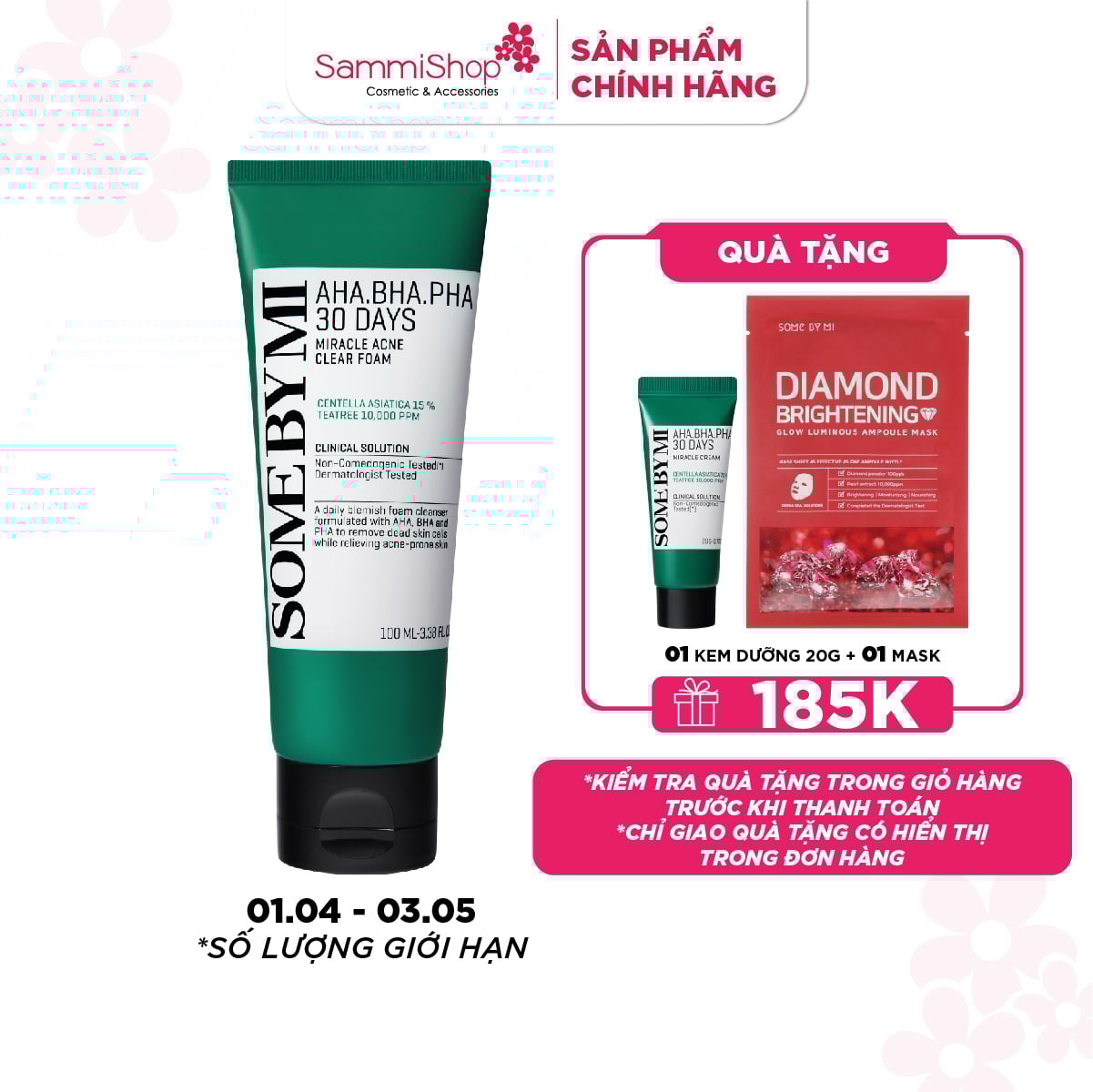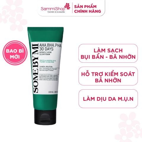 Sữa rửa mặt Some By Mi 30 Days Miracle Acne Clear Foam với công thức đặc biệt chứa phức hợp AHA – BHA – PHA hỗ trợ làm sạch tận sâu lỗ chân lông, lấy đi hết bụi bẩn, bã nhờn cho làn da thông thoáng không còn bí tắc, nhưng vẫn nhẹ dịu không gây kích ứng hay khô căng da, làm giảm mụn trứng cá hiệu quả.