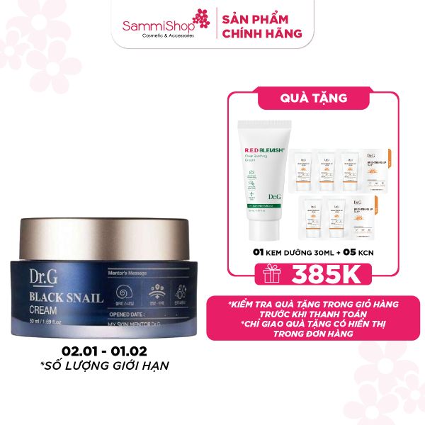 Dr.G Kem dưỡng Black Snail Cream 50ml là kem dưỡng chống lão hóa chuyên sâu với sức mạnh từ ốc sên đen cao cấp và keo ong đen, làm săn chắc da và chống lão hóa, cải thiện các dấu hiệu lão hóa như nếp nhăn, độ đàn hồi, kết cấu và độ sáng da, giúp da căng mịn và tươi trẻ.