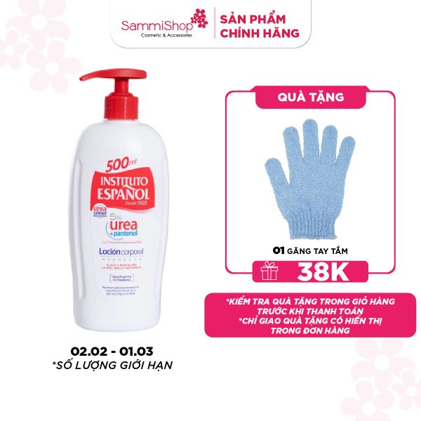 Instituto Español Sữa dưỡng 5% Urea + Pantenol Loción Corporal 500ml giúp tăng cường độ ẩm lâu dài và dưỡng chất cho làn da khô. Đồng thời lotion dưỡng ẩm hỗ trợ phục hồi và táo tạo lại làn da, hạn chrrd tình trạng bong tróc mang lại cho bạn làn da mịn màng như mong muốn. Sản phẩm không chứa Paraben và không gây dị ứng.