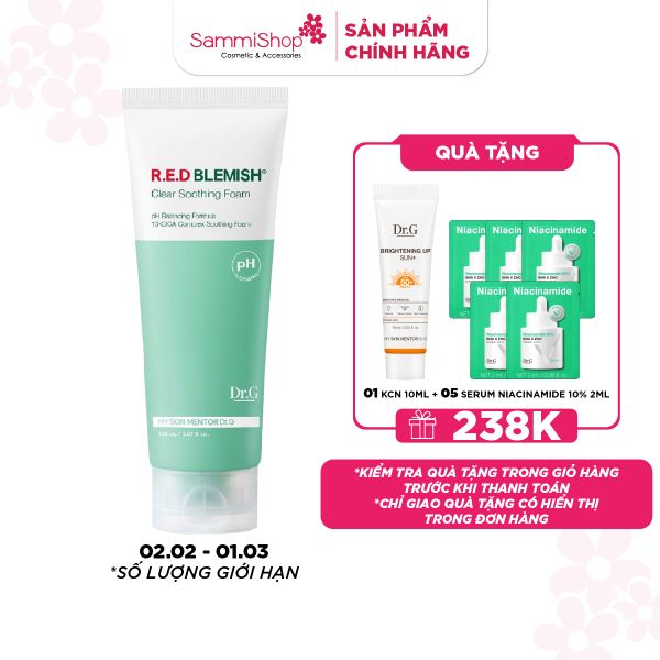 Sữa rửa mặt cho da dầu mụn, nhạy cảm Dr.G pH Cleansing R.E.D Blemish Clear Soothing Foam giúp làm sạch sâu và hỗ trợ trị mụn., kháng viêm, giảm sưng cho các vùng da mụn.