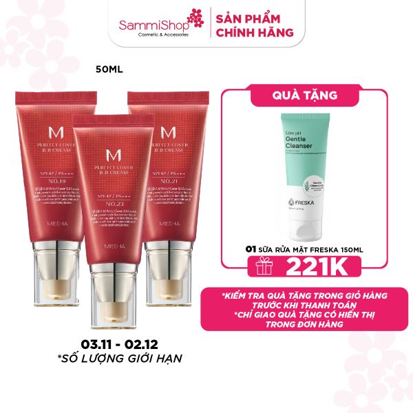 Missha Kem nền M Perfect Cover BB Cream EX SPF42 PA+++ 50ml là dòng kem nền đa năng dành cho những ai muốn có lớp nền mịn đẹp nhanh chóng mà không cần nhiều bước trang điểm. Sản phẩm kết hợp che phủ hoàn hảo, giữ nền lên tới 30H, kết hợp khả năng dưỡng ẩm và chống nắng SPF42 PA+++, giúp bảo vệ làn da trước tác hại từ môi trường trong khi vẫn giữ vẻ tự nhiên, căng bóng.Phân loại màu: