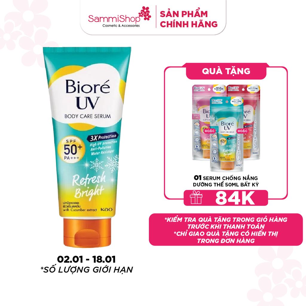 Serum chống nắng Bioré UV Anti-pollution Body Care Serum Refresh Bright ngăn chặn tia UVA và UVB hiệu quả trên da, dễ dàng tệp vào da mà không để lại lớp bột trắng hay cảm giác dính sau khi thoa. Công thức từ nước khoáng từ Nhật Bản và Công nghệ Gói dưỡng ẩm giúp cấp ẩm cho da. Ngoài ra còn chứa chiết xuất dưa chuột, Hydro Boost Jelly và Menthol để mang lại làn da tươi mát và thoải mái.