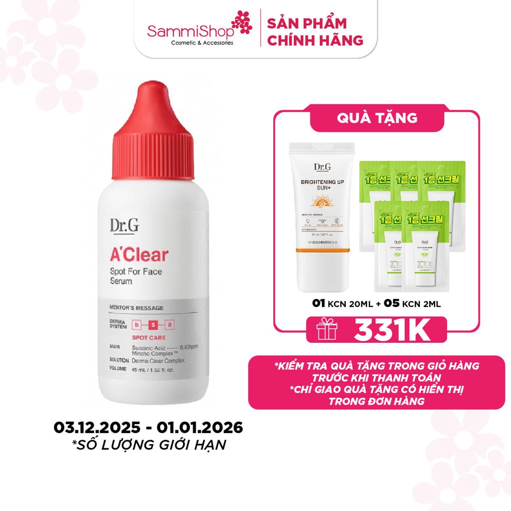 Tinh chất Dr.G A’Clear Spot For Face Serum giúp giảm dầu thừa và bã nhờn, giải quyết vấn đề mụn ẩn, mụn đầu đen, mụn sưng trên da hiệu quả mà không gây bong tróc, khô da hay kích ứng.