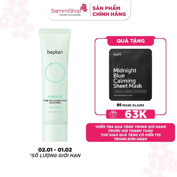 Beplain Kem chống nắng Sunmuse Tone Up & Correcting Sunscreen Mild Green SPF50+ PA++++ 50ml hiệu chỉnh sắc đỏ và làm dịu da. Là kem chống nắng vật lý với chỉ số SPF50+ PA++++