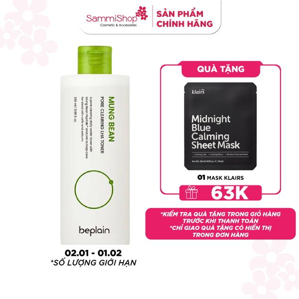 Beplain Nước hoa hồng Mung Bean Pore Clearing LHA Toner 265ml với khả năng kiềm dầu, tẩy da chết nhẹ giúp da thông thoáng khi sử dụng.