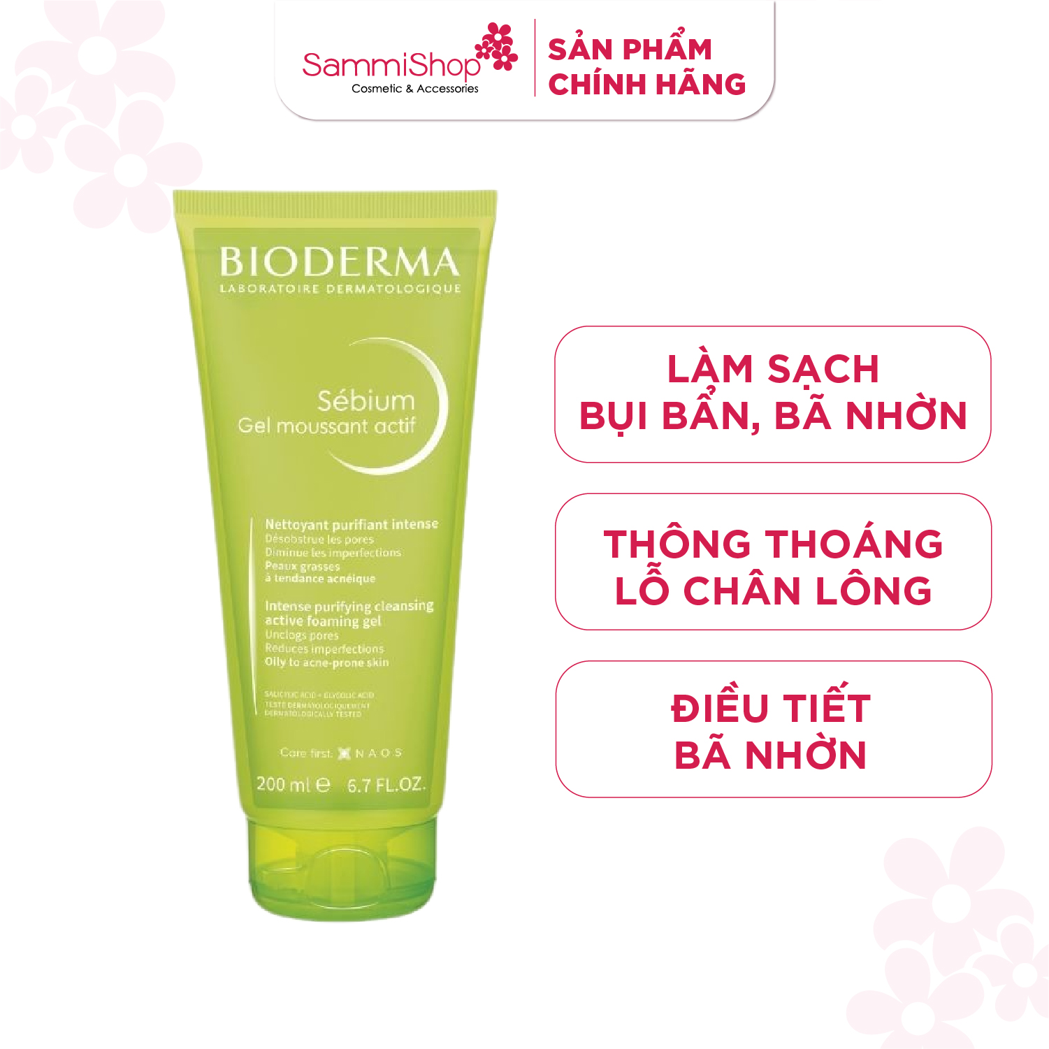 Sữa rửa mặt Bioderma Sebium Gel Moussant Actif chứa AHA BHA Sébium Gel moussant Actif giúp loại bỏ bụi bẩn, bã nhờn, tế bào chết, làm thông thoáng lỗ chân lông, từ đó giảm mụn đầu đen và mụn ẩn hiệu quả.