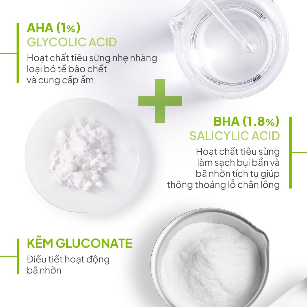 - Bộ đôi 1,8% BHA (Salicylic Acid) và 1% AHA (Glycolic acid) làm sạch bụi bẩn và bã nhờn, nhẹ nhàng loại bỏ da chết, giúp thông thoáng lỗ chân lông.