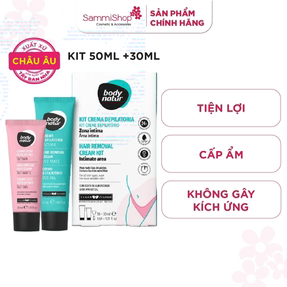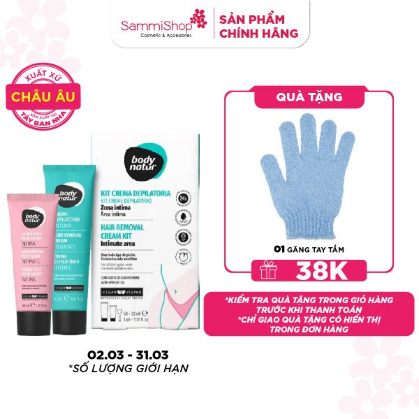 Body Natur Bộ kem tẩy lông Hair Removal Cream Kit Intimate Area 50+30ml bao gồm 2 tuýp: kem tẩy lông và kem làm dịu da sau tẩy, được nâng cấp với công thức mới cùng hương thơm quả mơ dịu nhẹ. Sản phẩm có tác dụng như một kem dưỡng da, mang lại cho bạn làn da sạch lông, mềm mại, được cung cấp dinh dưỡng và tăng độ đàn hồi. Chỉ sau một lần sử dụng, bạn sẽ cảm nhận được hiệu quả đáng kinh ngạc của sản phẩm với khả năng tẩy lông chỉ sau 3 phút, đồng thời ngăn ngừa kích ứng và giúp da dưỡng ẩm vượt trội suốt 24 giờ.