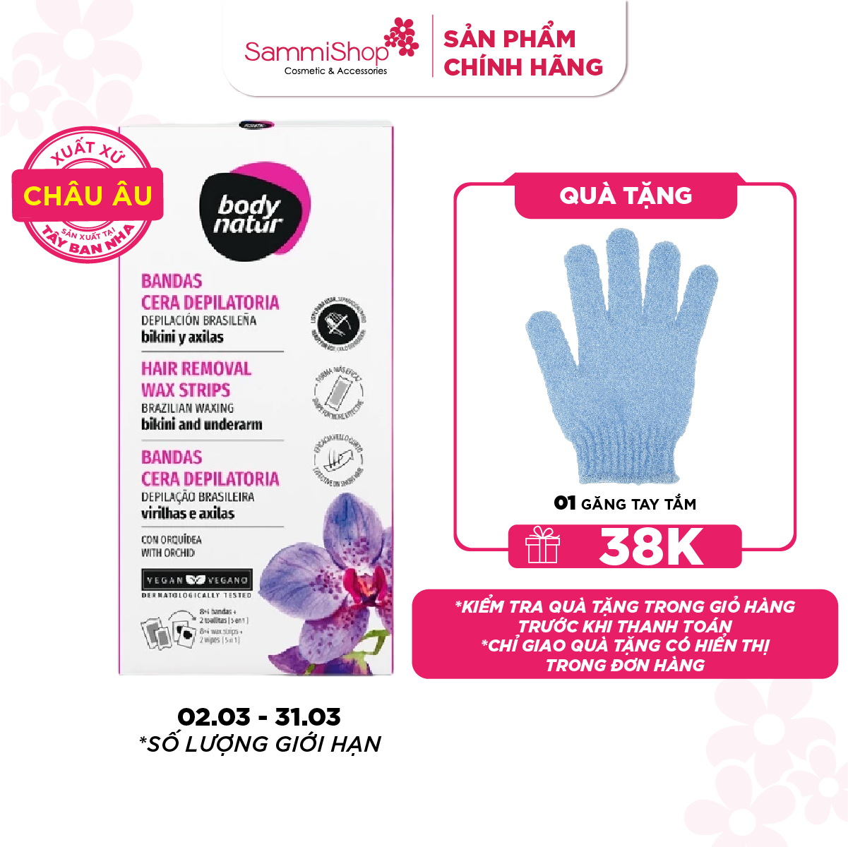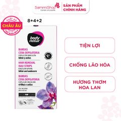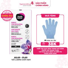 Body Natur Bộ Miếng Dán Tẩy Lông Hair Removal Wax Strips Brazilian Waxing Bikini And Underarm mang đến trải nghiệm triệt lông hiệu quả, tiện lợi và thư giãn với hương thơm hoa lan ngọt ngào, giúp chống lão hóa, điều hòa sắc tố da và mang lại độ sáng mịn cho làn da. Với khăn lau đi kèm 5 trong 1 có tác dụng chăm sóc da sau tẩy: làm sạch, làm dịu, dưỡng da ẩm mịn, dưỡng trắng, làm chậm quá trình lông mọc lại.