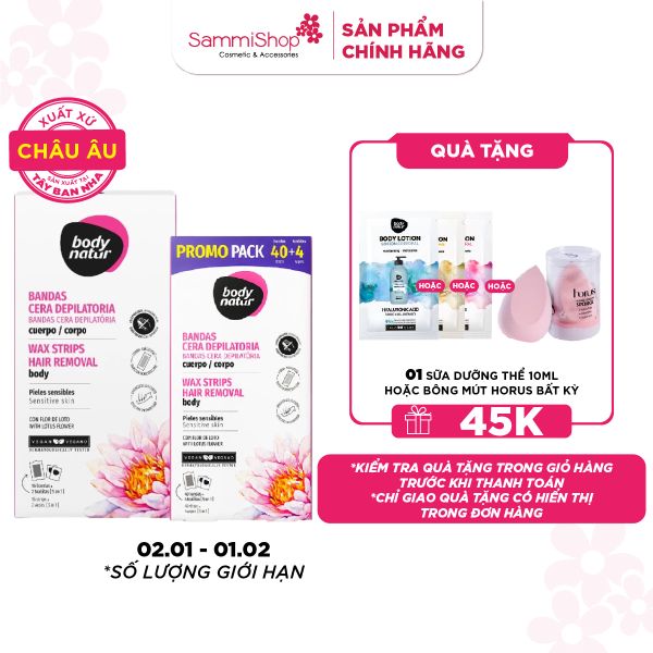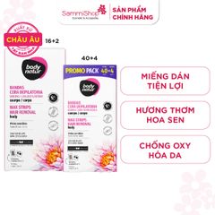 Body Natur Bộ miếng dán tẩy lông Wax Strips Hair Removal Body Sensitive Skin mang đến trải nghiệm triệt lông hiệu quả, tiện lợi và thư giãn với hương thơm hoa sen dịu nhẹ, giúp chống oxy hóa, kích thích tái tạo tế bào. Với khăn lau đi kèm tác dụng 5 trong 1 giúp chăm sóc da sau tẩy: làm sạch, làm dịu da, dưỡng da ẩm mịn, dưỡng trắng, làm chậm quá trình lông mọc lại.