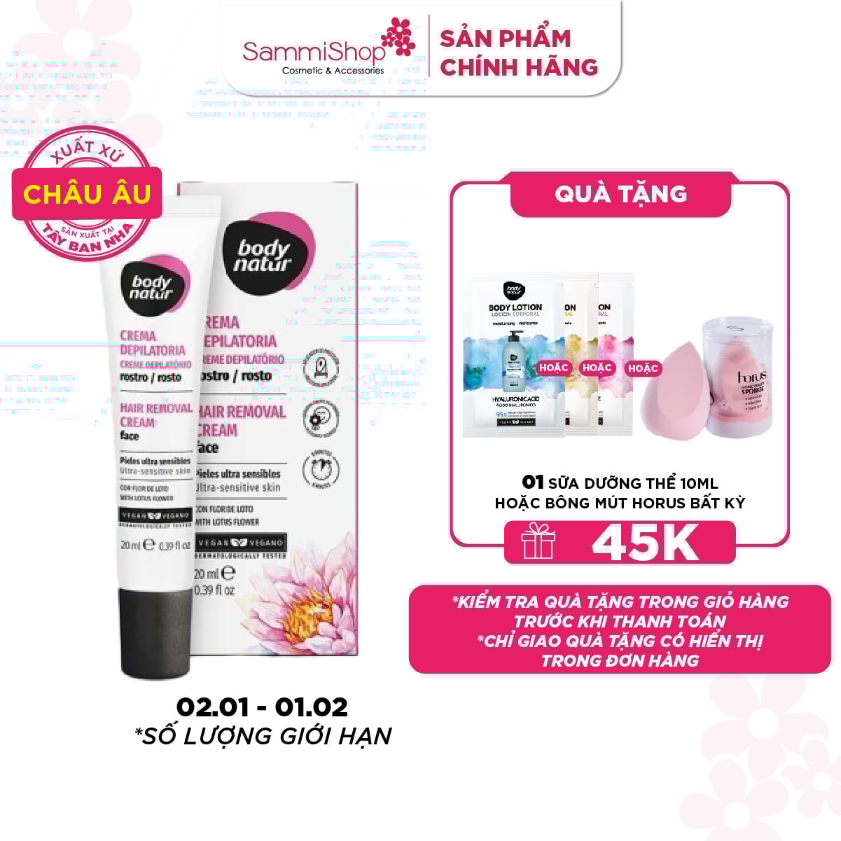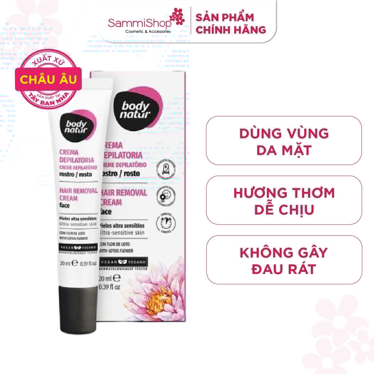 Body Natur Kem Tẩy Lông Hair Removal Cream Face Ultra-Sensitive Skin With Lotus Flower được nâng cấp với công thức mới cùng hương thơm hoa sen dịu nhẹ, giúp chống oxy hóa, kích thích tái tạo tế bào và dưỡng ẩm cho da. Chỉ sau một lần sử dụng, bạn sẽ cảm nhận được hiệu quả đáng kinh ngạc của sản phẩm với khả năng tẩy lông nhẹ nhàng chỉ sau 5 phút, đồng thời ngăn ngừa kích ứng và giúp da dưỡng ẩm vượt trội suốt 24 giờ