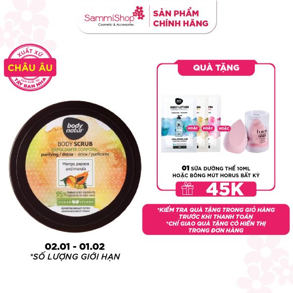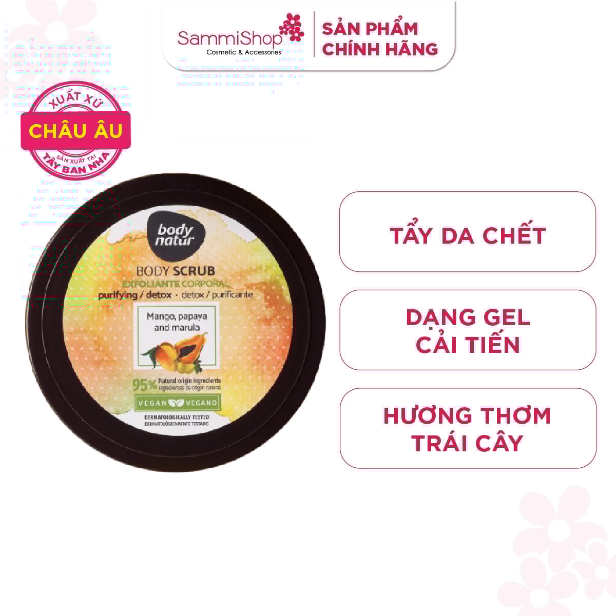 Body Natur Tẩy da chết cơ thể Body Scrub Mango, Papaya and Marula sẽ mang đến cho bạn trải nghiệm chăm sóc cơ thể đa giác quan nhờ các đặc điểm nổi bật: kết cấu dạng gel cải tiến, tẩy tế bào chết đa tầng, công thức thuần chay từ nhiều loại trái cây đa dạng và hương thơm tươi mát, dễ chịu.