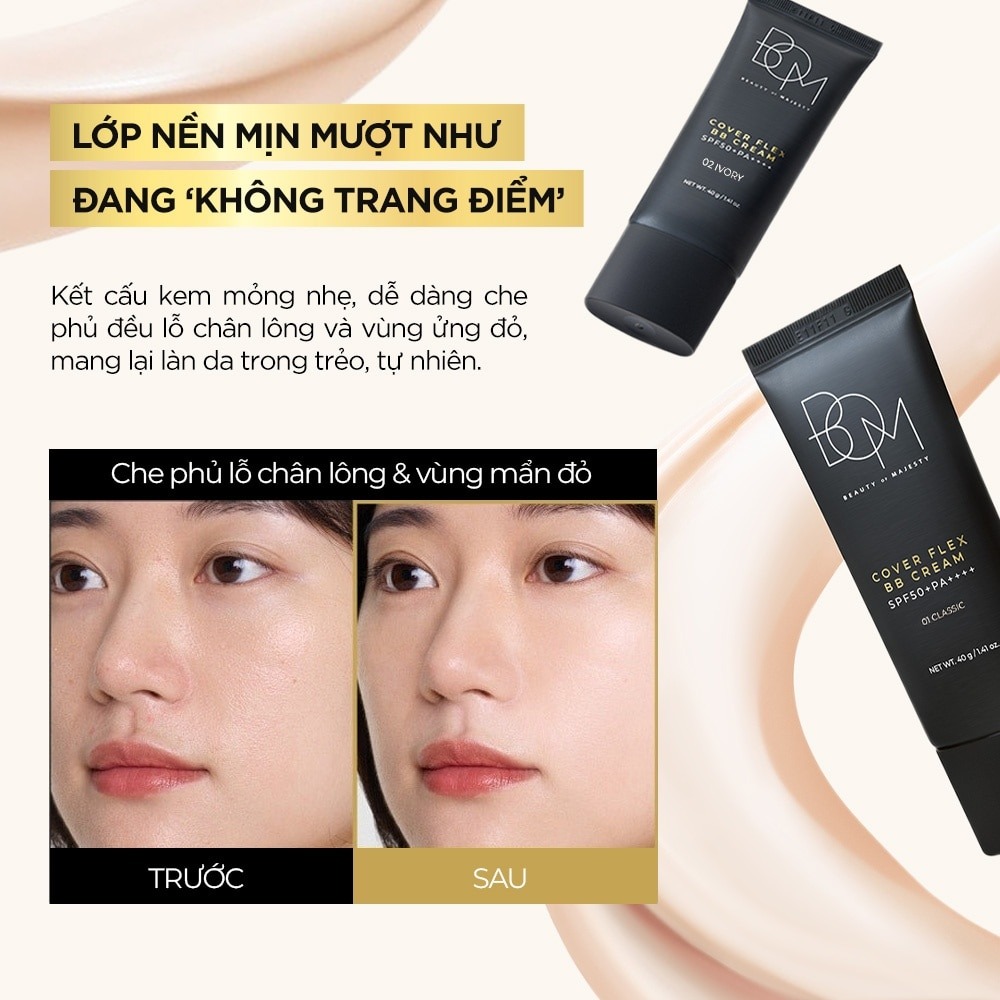 BOM Kem nền Cover Flex BB Cream SPF50+PA++++ 40g có chất kem mỏng nhẹ với độ che phủ cao, cho bạn một làn da mịn màng, tự nhiên mà không cần nhiều lớp trang điểm.