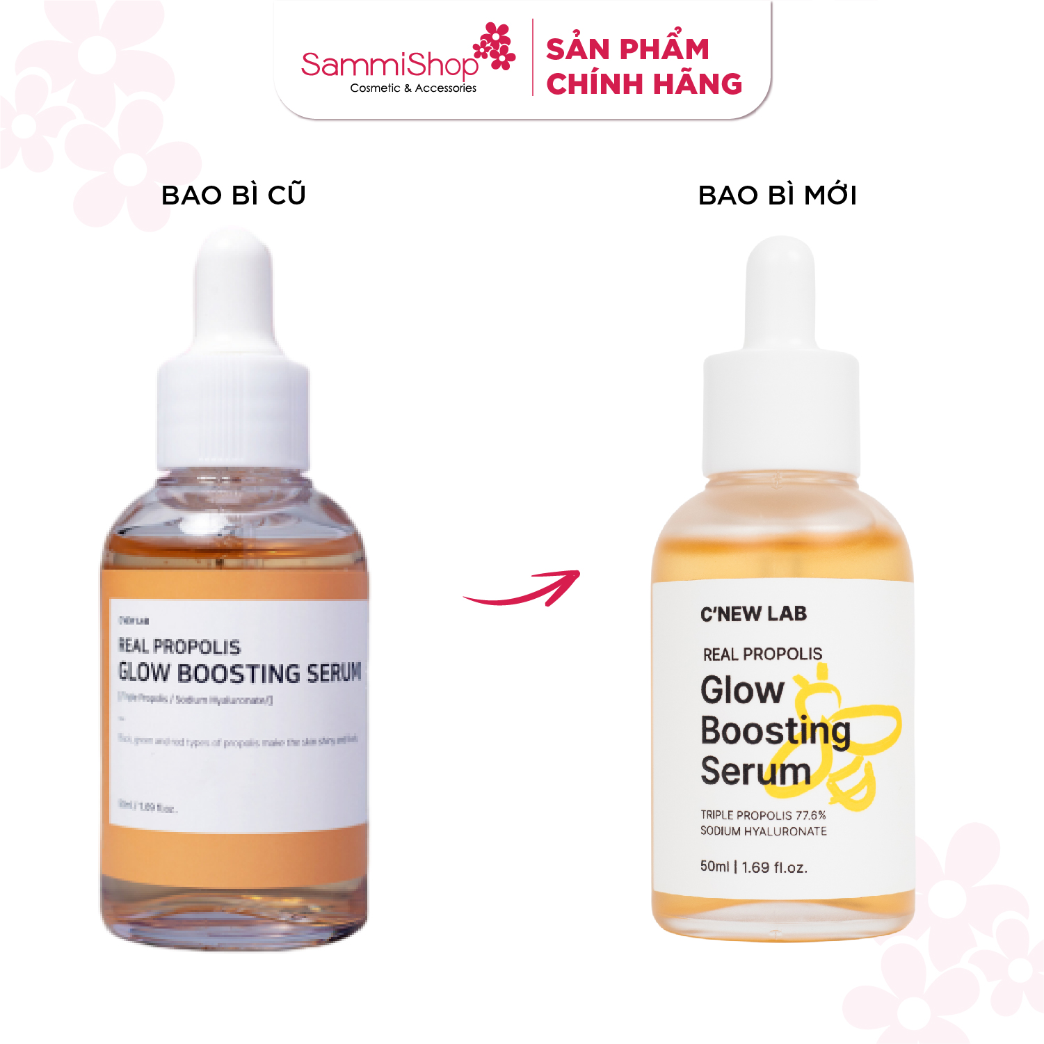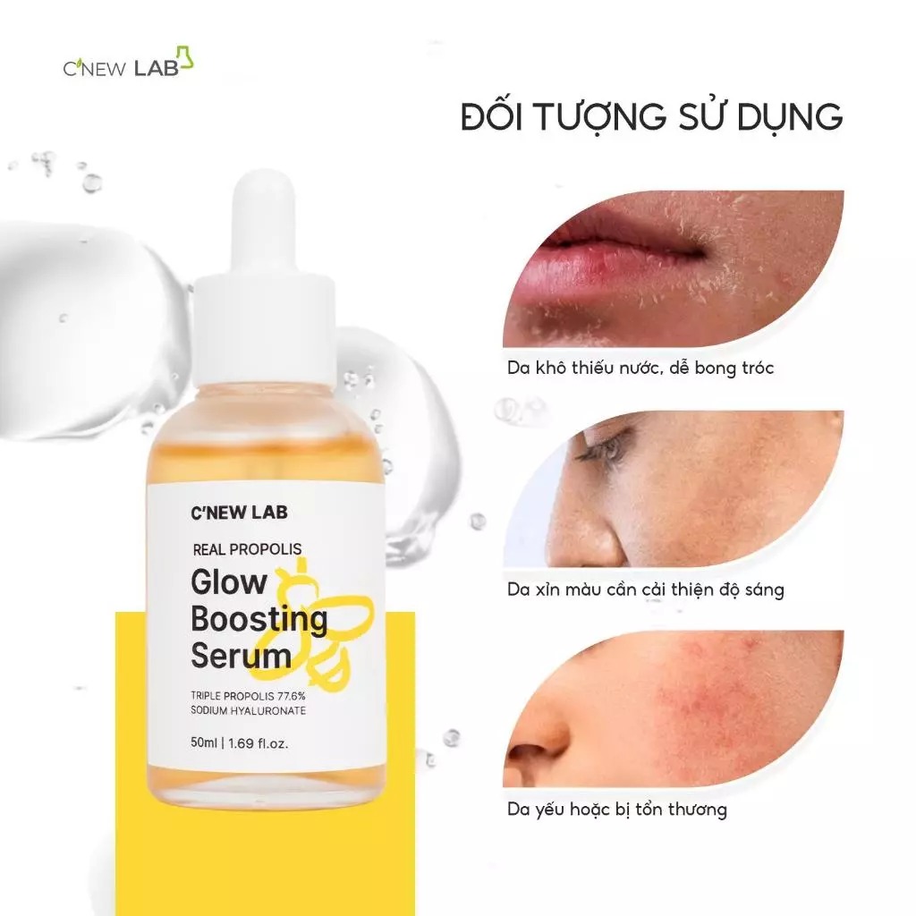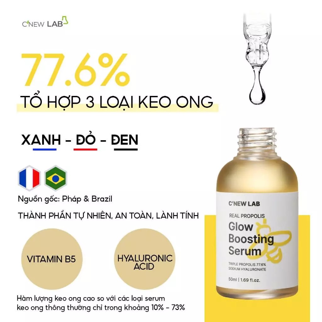 Tinh chất C'New Lab Real Propolis Glow Boosting Serum chứa 77,6% keo ong (Đen + Đỏ + Xanh) bản quyền và Sodium Hyaluronate dễ dàng thẩm thấu, nuôi dưỡng làn da sáng mịn, tươi khỏe từ sâu bên trong.