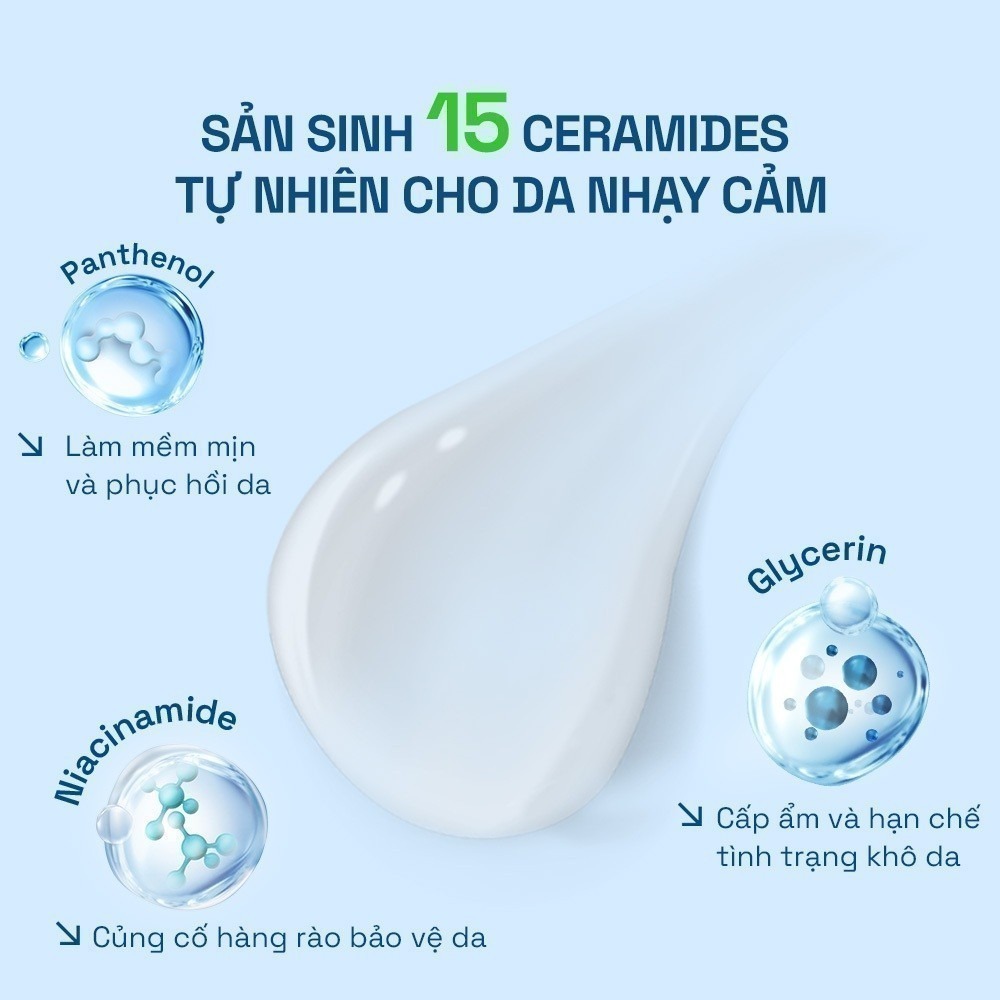 - Công thức khoa học mới với sự kết hợp 3 thành phần lành tính: Niacinamide (Vitamin B3), Panthenol (Pro-vitamin B5) và Glycerin đã tạo ra cơ chế đặc biệt giúp thúc đẩy quá trình sản sinh Ceramides tự nhiên của da và tổng hợp Fillaggrin có dụng bảo vệ hàng rào tự nhiên của da giúp cải thiện khả năng phục hồi của làn da nhạy cảm.