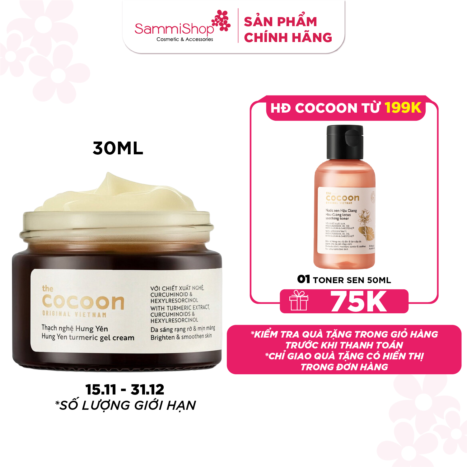 Thạch nghệ Hưng Yên Cocoon Turmeric Gel Cream với kết cấu mỏng nhẹ, thạch nghệ Hưng Yên mang những dưỡng chất từ củ nghệ, Curcuminoid và Hexylresorcinol thấm nhanh vào da giúp làm sáng, chống oxy hoá và làm mờ vết thâm. Làn da trở nên mịn màng và đều màu trong thấy.