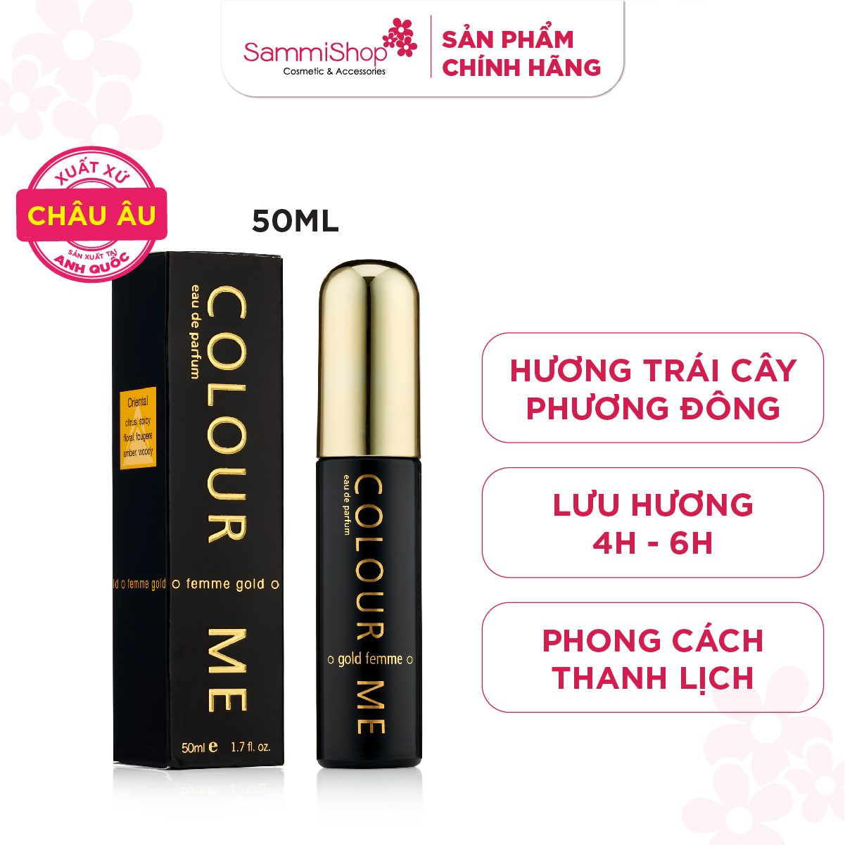 Colour Me Nước hoa Gold Femme Eau De Parfum mang đến khởi đầu đầy sức sống với hương thơm rạng rỡ từ cam, chanh và lê. Điểm nhấn của mùi hương nằm ở hoa phong lữ mềm mại hòa quyện cùng tuyết tùng ấm áp và hoắc hương thanh lịch đã tạo nên bản giao hưởng hương thơm quyến rũ.