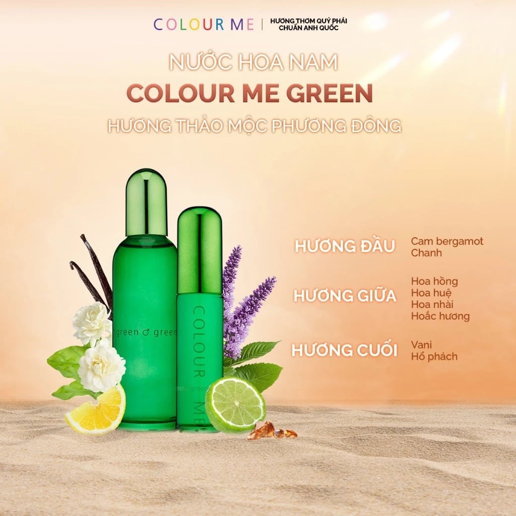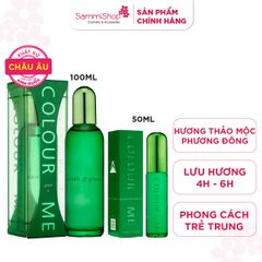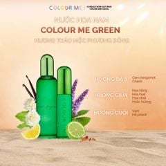 Colour Me Nước hoa Green Eau De Parfum ghi dấu ấn phong cách trẻ trung và năng động nhờ hương thơm tươi mát của cam bergamomt và chanh tươi, kết hợp hài hòa cùng làn hương quyến rũ của hoắc hương và hòa nhài. Hương thơm trở nên trọn vẹn và lôi cuốn hơn với hương vani ngọt ngào và hổ phách ấm áp.