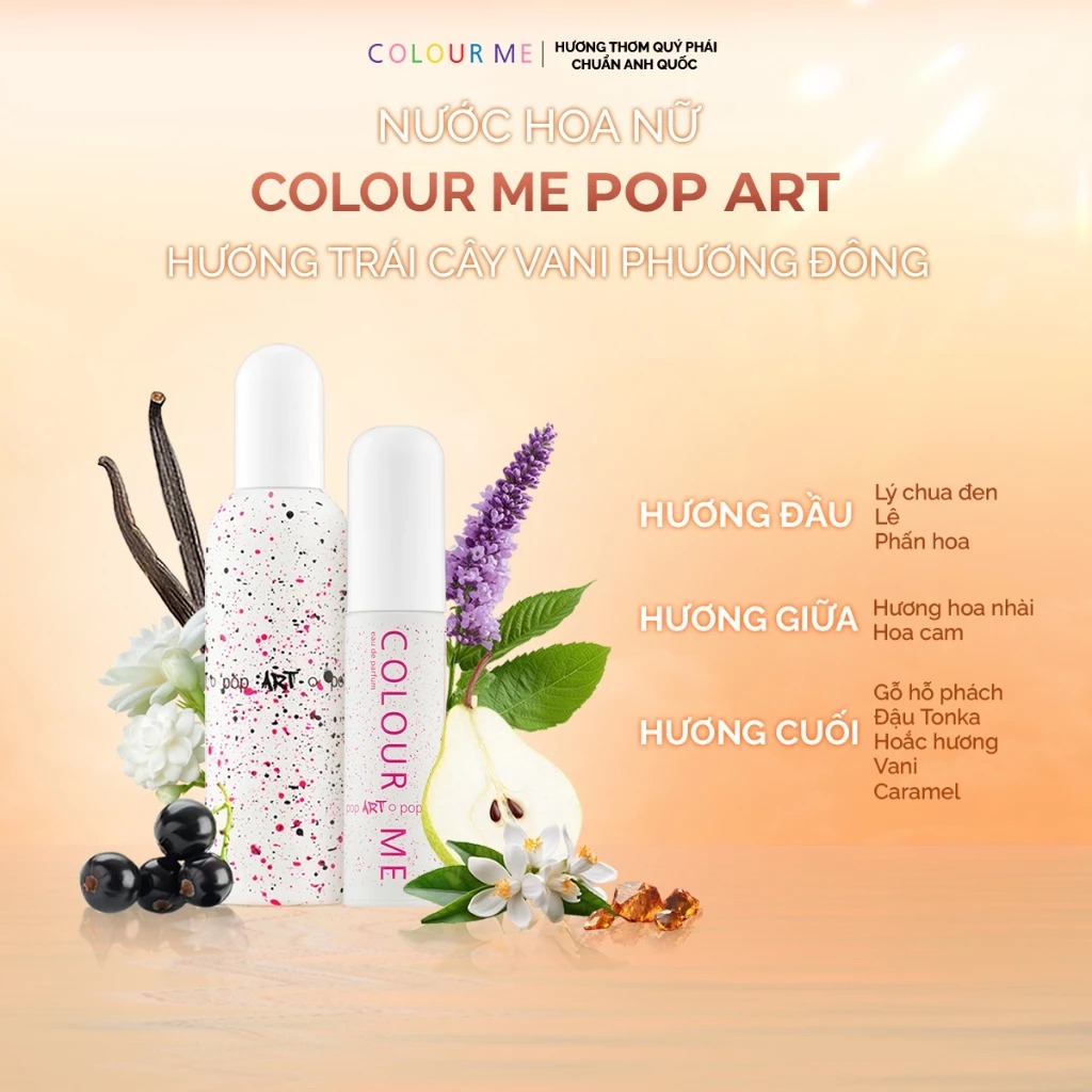 Colour Me Nước hoa Pop Art Eau De Parfum tạo ấn tượng đầu tiên với hương thơm ngọt ngào của quả lý chua đen, lê và vani. Hương hoa nhài tinh khiết đan xen với hoắc hương và gỗ hổ phách tạo nên hương thơm yêu kiều, thu hút mọi sự chú ý.