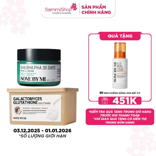 Some By Mi Kem dưỡng AHA-BHA-PHA 30 Days Miracle Cream chứa 3 loại acid AHA - BHA - PHA giúp hỗ trợ điều trị mụn, loại bỏ tế bào chết. Và rau má giúp làm dịu tổn thương da, mẩn đỏ và phục hồi hàng rào vảo vệ da.