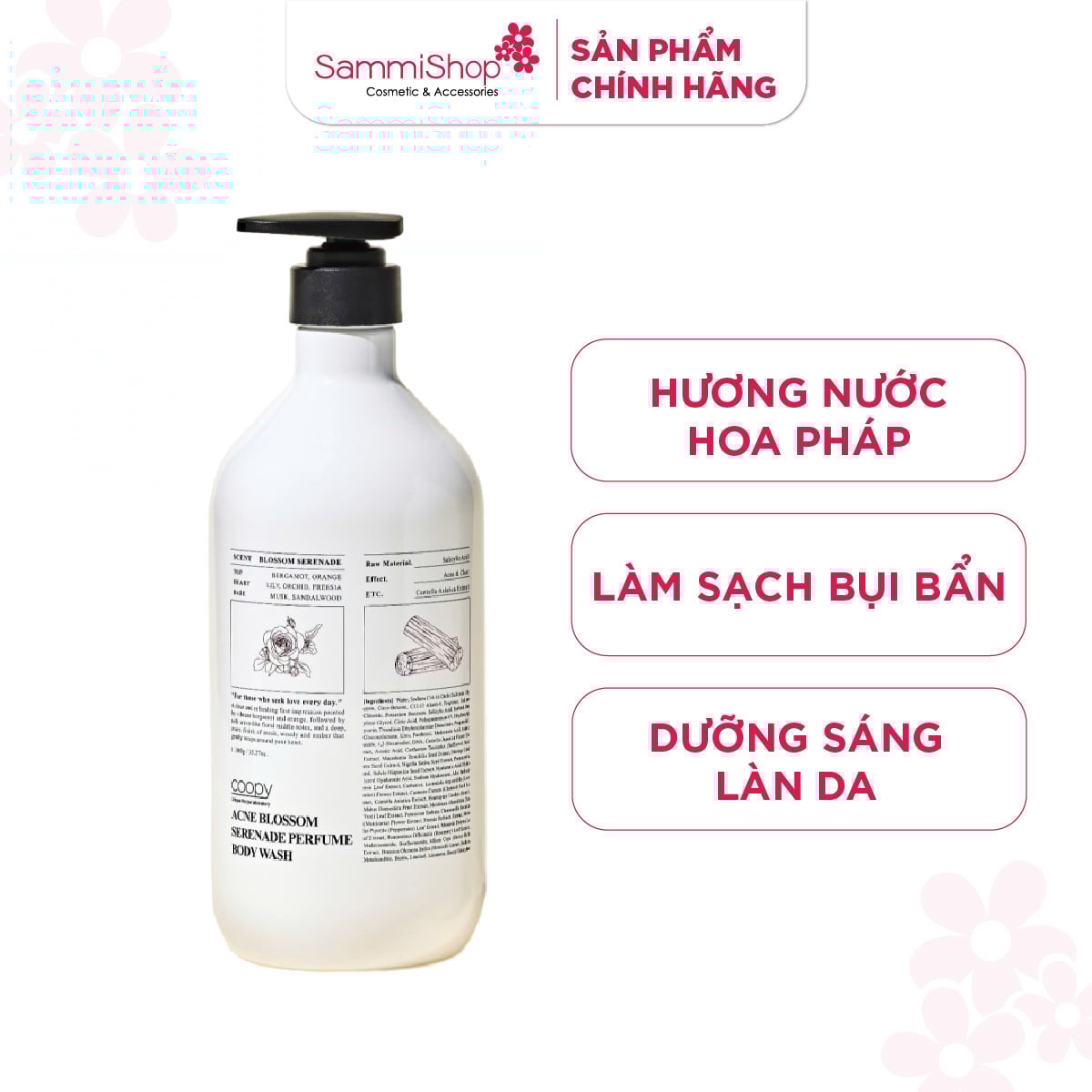 Coopy Sữa tắm Acne Blossom Serenade Perfume Body Wash 1000g giúp cho làn da nám, da sỉn màu, da tổn thương được phục hồi nhanh chóng và tràn đầy sức sống. Hương thơm quyến rũ của hoa hồng không chỉ mang lại trải nghiệm tinh tế trong quá trình tắm, mà còn giúp tạo cảm giác thư giãn và dễ chịu.