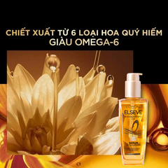 Dầu dưỡng tóc L'Oréal Elsseve Extraordinary Oil có chứa dưỡng chất 6 loại dầu tự nhiên: dầu argan, hoa hồng, hoa sen, hoa hướng dương, hoa cúc và đậu nành, có công dụng rất tốt trong việc nuôi dưỡng tóc từ sâu bên trong, tóc sẽ chắc khỏe hơn, bồng bềnh và dễ vào nếp.