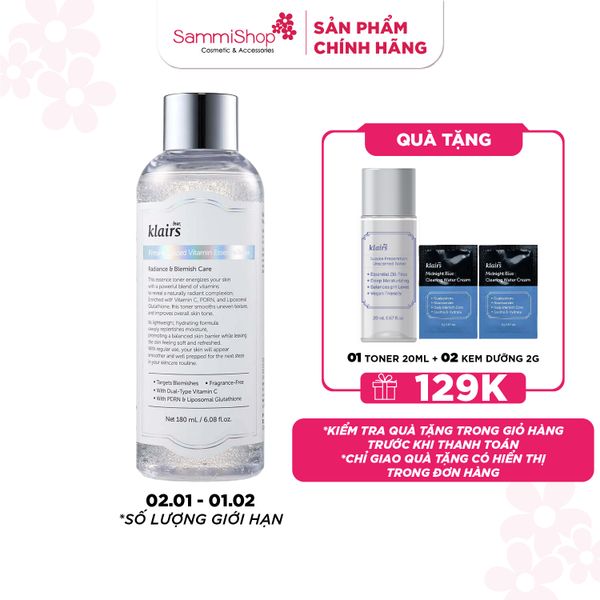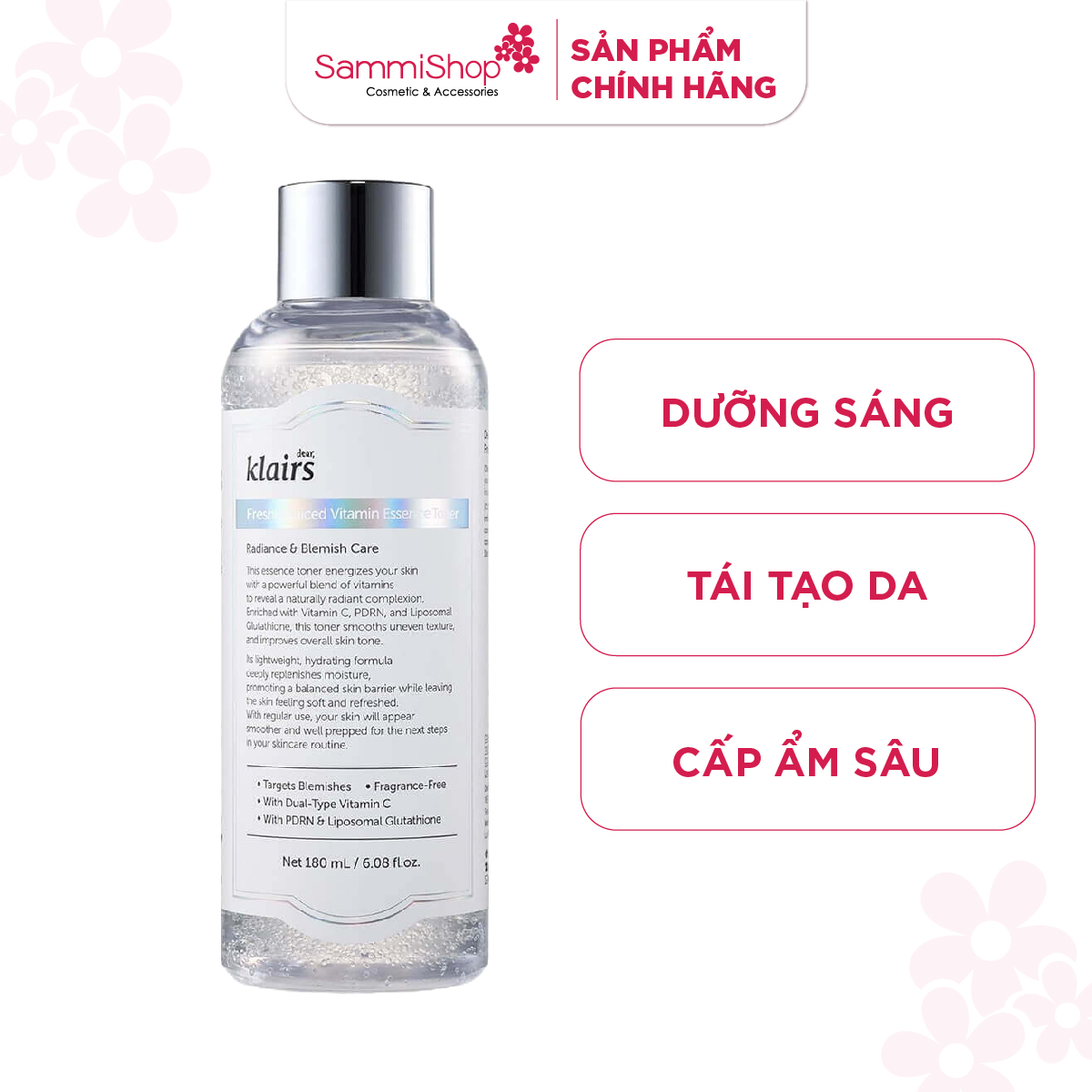 Dear, Klairs Nước hoa hồng Freshly Juiced Vitamin Essence Toner 180ml chứa viên nang Vitamin kết hợp cùng PDRN. Công thức 2-trong-1 với hiệu quả của cả toner và essence, mang lại dưỡng chất đầy đủ chỉ trong một bước đơn giản