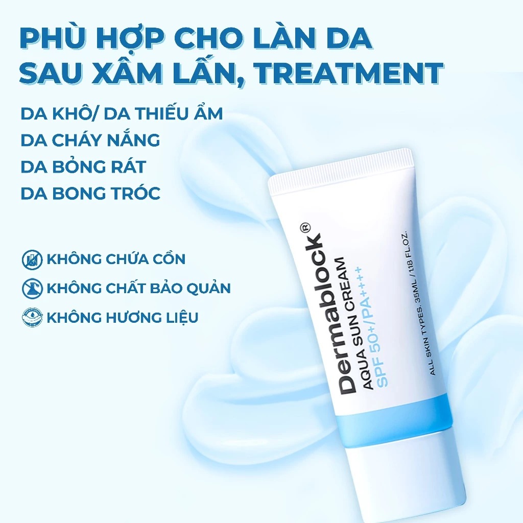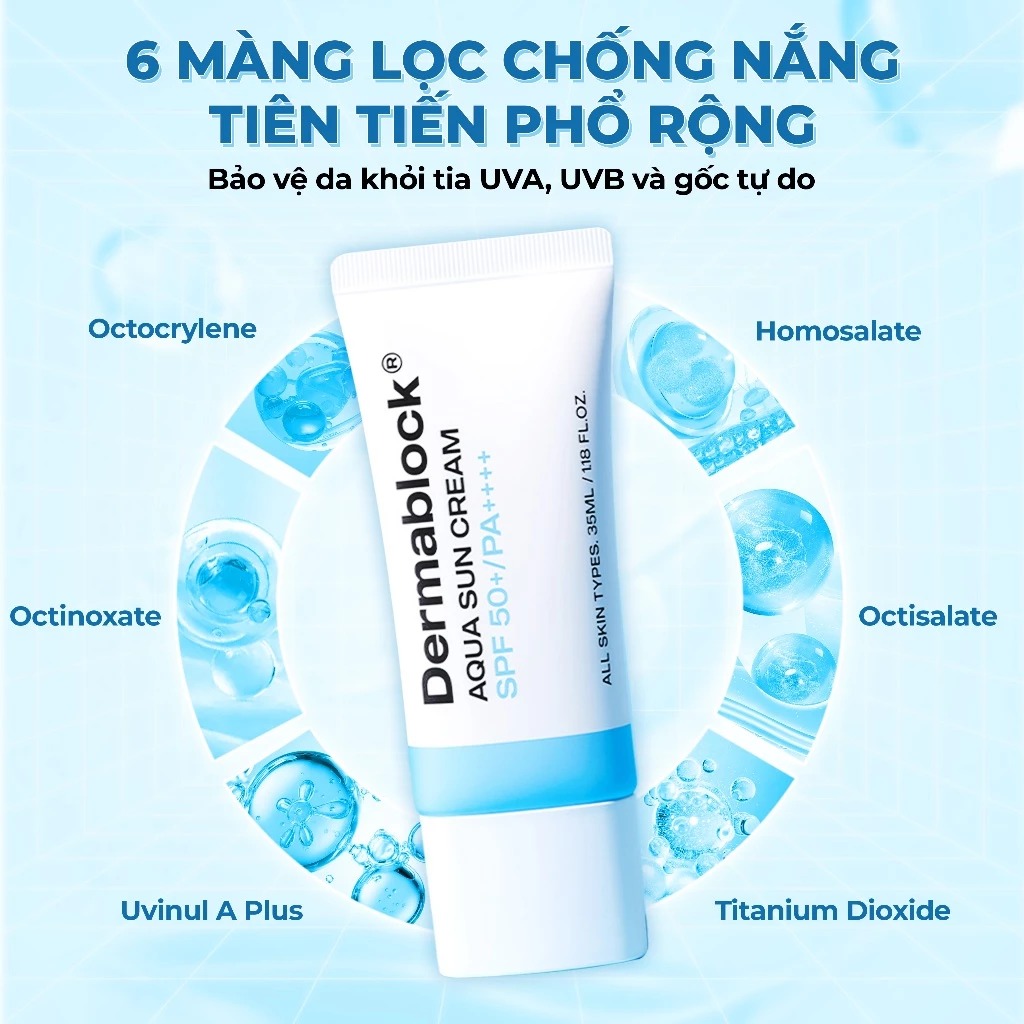 Dermablock Kem chống nắng Aqua Sun Cream SPF50+PA++++ 35ml với công nghệ độc quyền Aqua matrix giúp làm mát và dịu da tức thì. Mang lại làn da luôn được tươi mát, giảm thiểu độ mẫn cảm của làn da