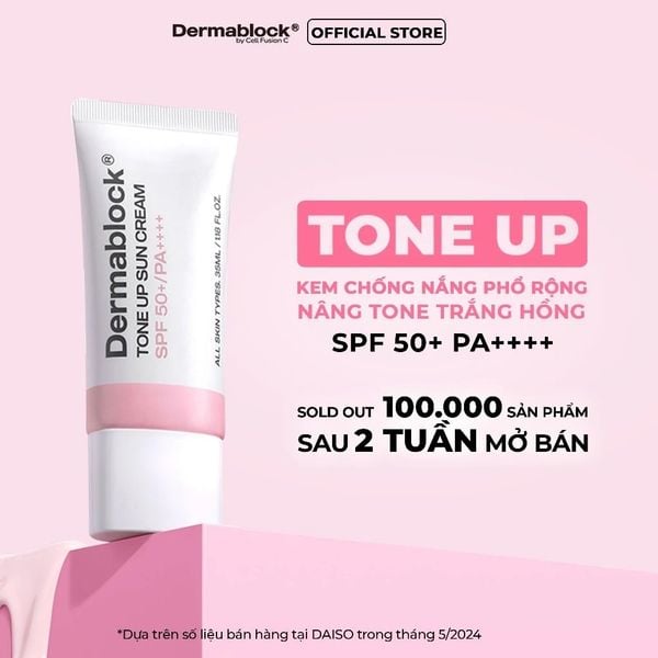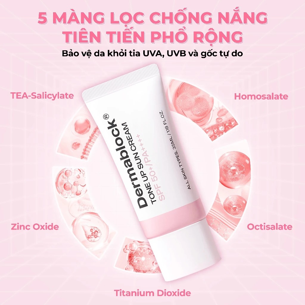 Dermablock Kem chống nắng Tone Up Sun Cream SPF50+PA++++ 35ml với hiệu ứng nâng tone sáng hồng tự nhiên, giữ tone bền màu suốt 8h. Ngoài ra, sản phẩm còn ngăn ngừa các vấn đề lão hóa do tia cực tím và gốc tự do, bảo vệ làn da tối đa trước các tác động bên ngoài.