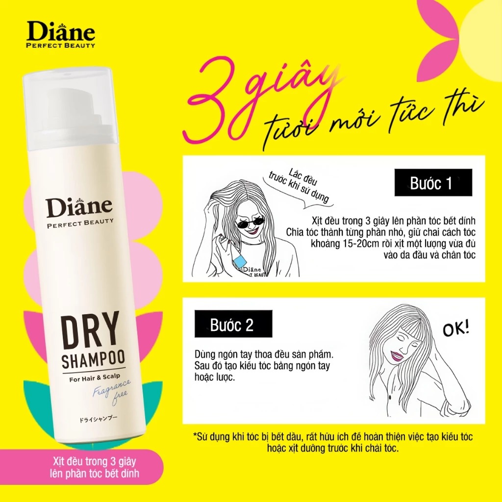 Diane Dầu gội khô Perfect Beauty Dry Shampoo Fragrance Free dạng khí nén loại bỏ sạch dầu thừa trên tóc, kết hợp thành phần dưỡng chất nuôi dưỡng tóc chắc khỏe mềm mượt. Hương cam & lê tươi mát mang lại sự thoải mái khi sử dụng