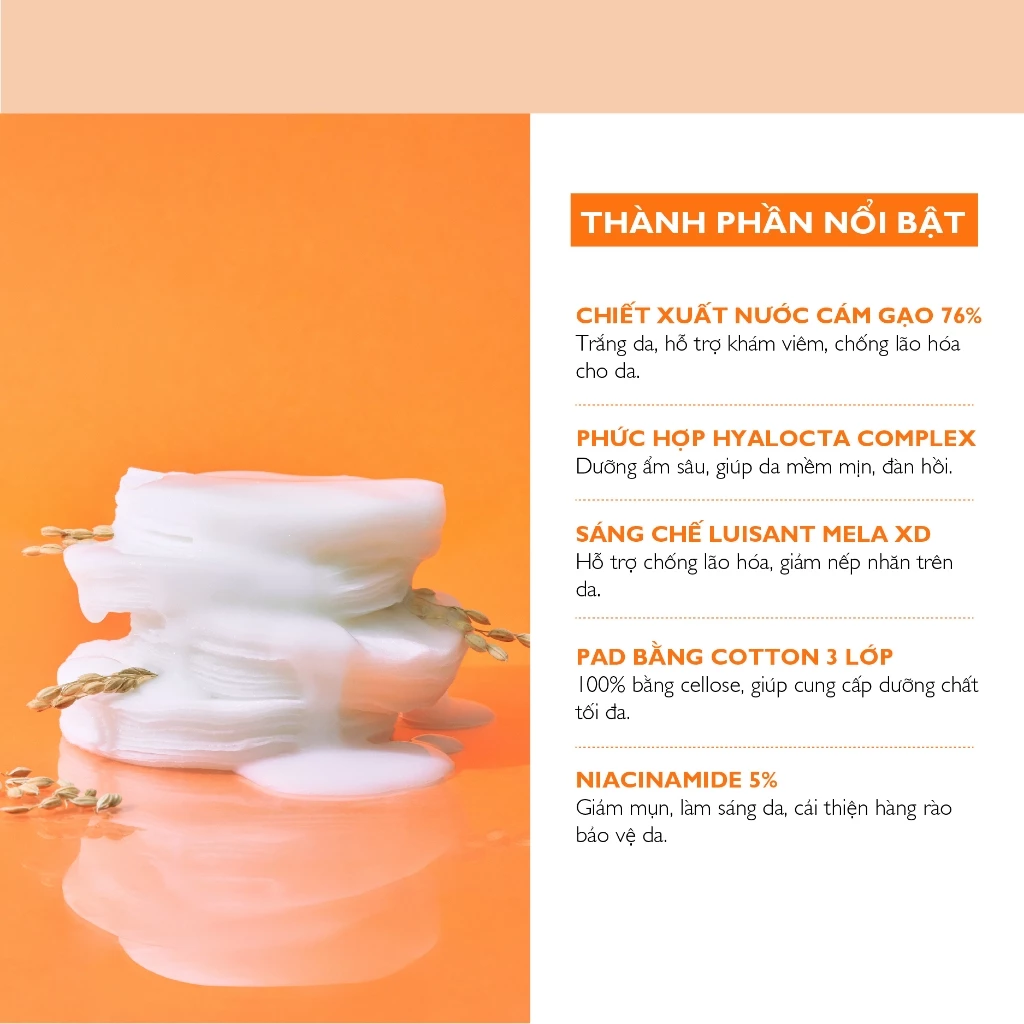 - Chiết xuất nước cám gạo 76% giúp trắng da, hỗ trợ khám viêm, chống lão hóa cho da.