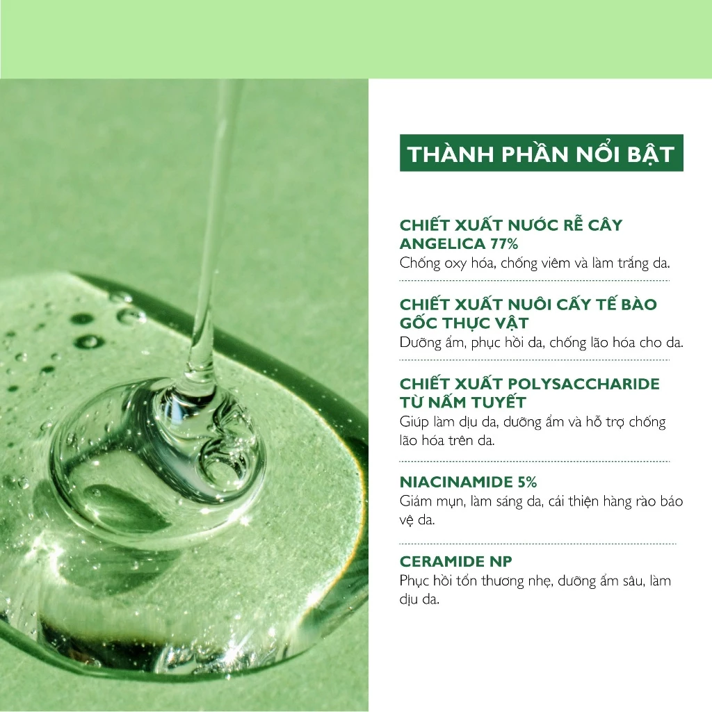 - Chiết xuất nước rễ cây ANGELICA 77% giúp chống oxy hóa, chống viêm và làm trắng da.