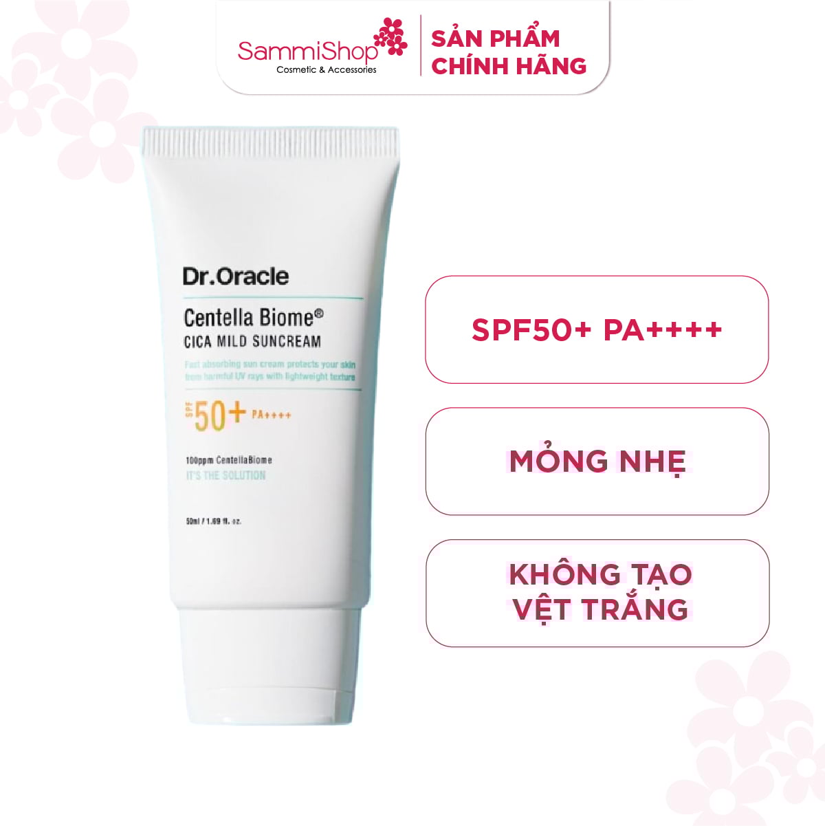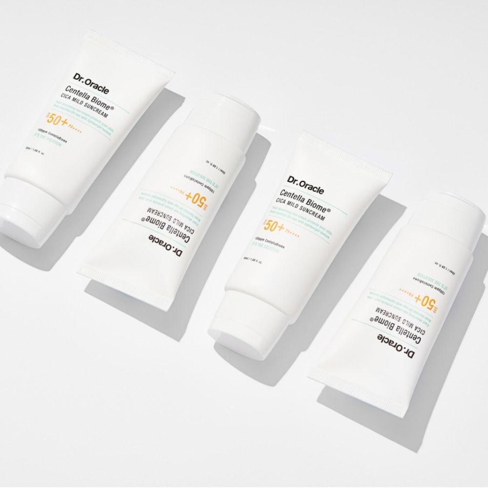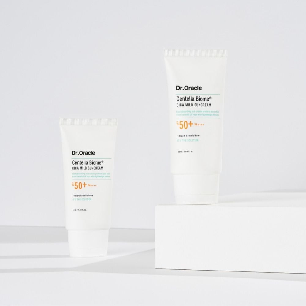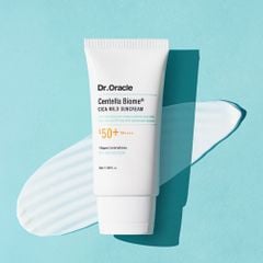 Dr.Oracle Kem chống nắng Centella Biome Cica Mild Suncream 50ml vật lý lai hóa học dịu nhẹ cho cả da nhạy cảm, bảo vệ da trước tia UV đến 98% với công nghệ lọc kép, chỉ số SPF 50+ và PA++++. Đồng thời bổ sung độ ẩm, dưỡng da và tăng cường hàng rào bảo vệ da. Kết cấu mỏng nhẹ, thấm nhanh, không bết dính, không để lại vệt trắng, lâu trôi và dễ dàng được loại bỏ sau một bước làm sạch.
