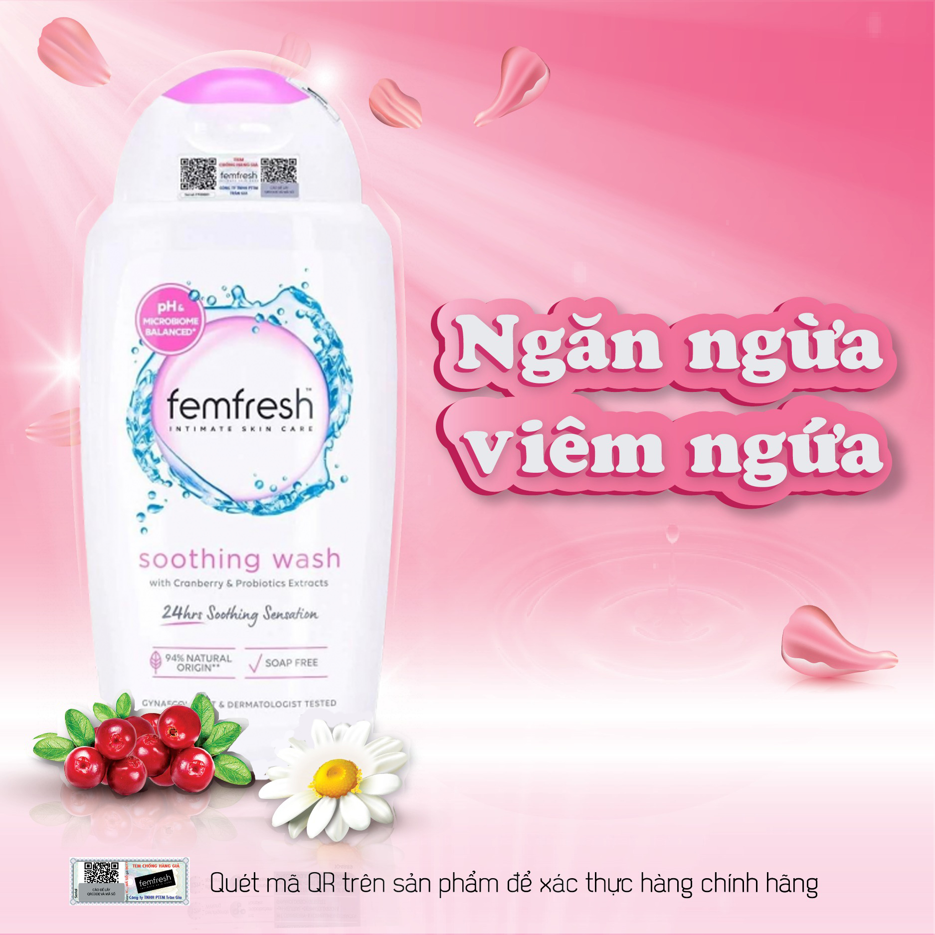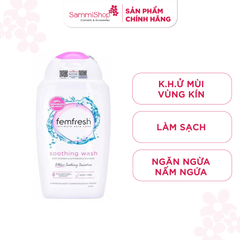 Dung dịch vệ sinh phụ nữ Femfresh Soothing Wash chiết xuất từ các thảo dược thiên nhiên giúp hỗ trợ kháng khuẩn, kháng viêm, chống oxy hóa, tươi trẻ thơm mát. Sản phẩm không chứa xà phòng và không gây dị ứng.
