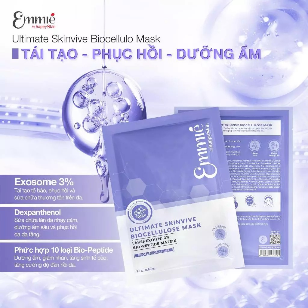 Emmie by Happyskin Mặt Nạ Ultimate Skinvive Biocellulose Mask 25g giúp dưỡng ẩm, tăng cường thẩm thấu dưỡng chất kết hợp cùng Exosome 3%, phức hợp 10 loại bio-peptide làm dịu cấp kì, phục hồi da nhạy cảm, giảm đỏ và tái tạo da. Có thể sử dụng sau các liệu trình xâm lấn da, cải thiện các nếp nhăn nông và các dấu hiệu lão hóa, giúp da trông căng bóng và mịn màng.
