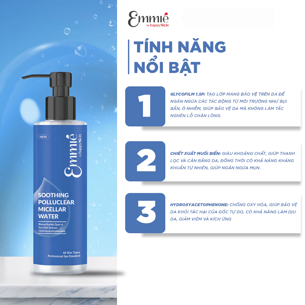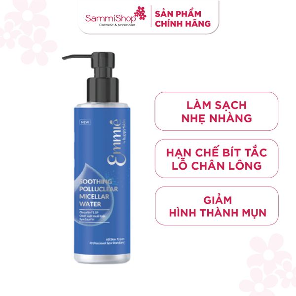 Emmie by Happyskin Nước Tẩy Trang Soothing Polluclear Micellar Water 220ml giúp tẩy sạch bụi mịn đến từ không khí, thông thoáng lỗ chân lông và hạn chế mụn ẩn, kích ứng