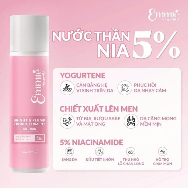 Emmie by Happyskin Nước Thần Bright & Plump Probio Ferment Solution 150ml Dịu nhẹ trên mọi loại da và thích hợp để dùng hằng ngày. Không chỉ cấp ẩm mà còn làm mềm, mịn, sáng da. Hỗ trợ tạo nên làn da căng mọng và tăng thẩm thấu cho các sản phẩm dưỡng và đặc trị khác