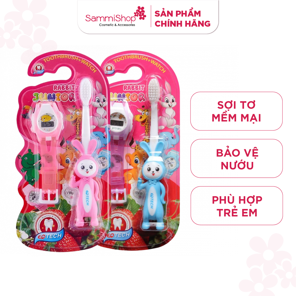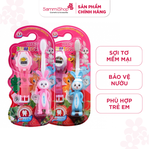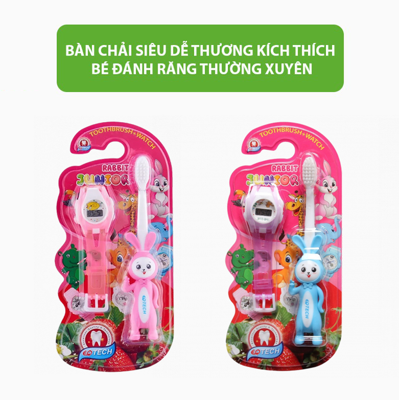 Bộ bàn chải đánh răng trẻ em Junior Rabbit & Watch gồm 1 bàn chải thiết kế hình thỏ ở đầu cán tăng sự ngộ nghĩnh đáng yêu dành cho trẻ và 1 đồng hồ đeo tay điện tử.