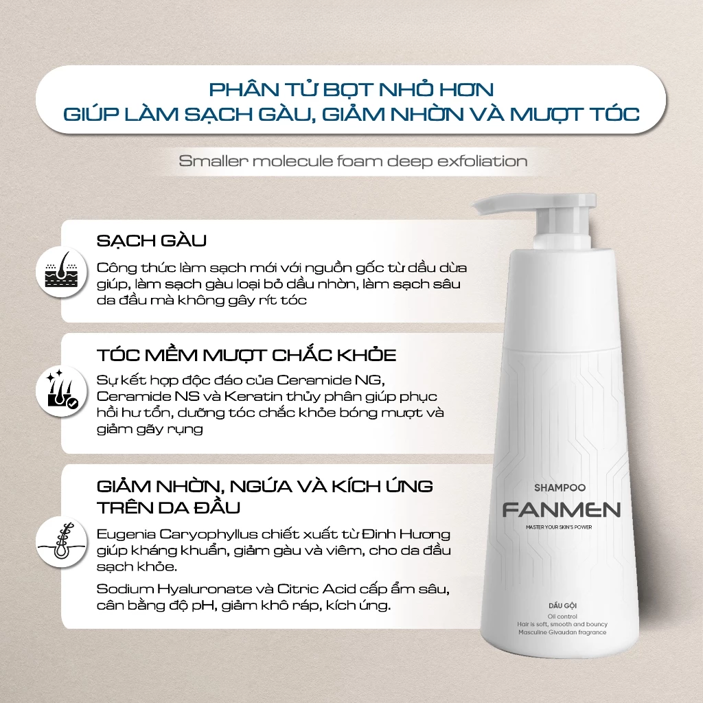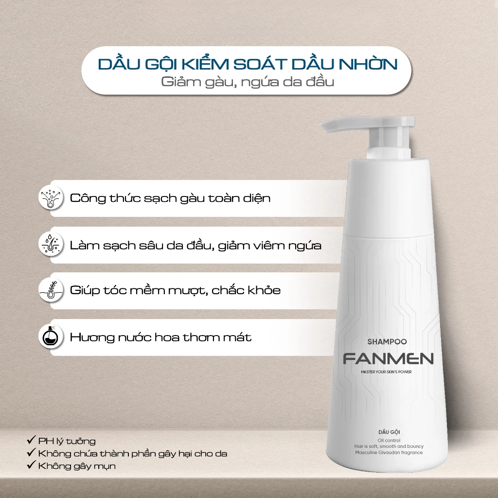 Fanmen Dầu gội Fanmen muối biển cho nam giới 350ml phù hợp với nam giới thường vận động nhiều, khiến da đầu tiết nhiều dầu nhờn và mồ hôi, gây mất tự tin. Sản phẩm sẽ giúp giảm gàu và ngứa, mang lại sự tự tin khi sử dụng
