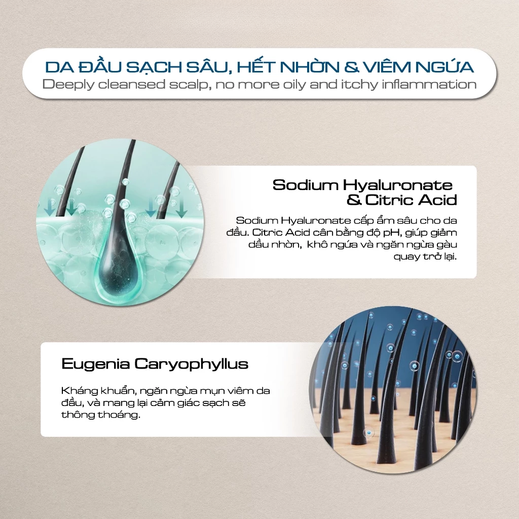 - Dưỡng ẩm sâu: Sodium Hyaluronate và Citric Acid giúp cân bằng độ ẩm, ngăn ngừa khô da đầu.
