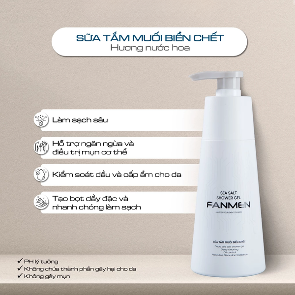 Fanmen Sữa tắm Sea Salt Shower Gel 350ml giúp hạn chế mụn lưng, da khô ráp. Mang lại cảm giác da mềm mịn sạch sẽ, không bị bết dính, không bị khó làm sạch khi tắm, , cảm nhận được mùi hương nam tính