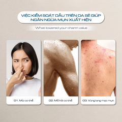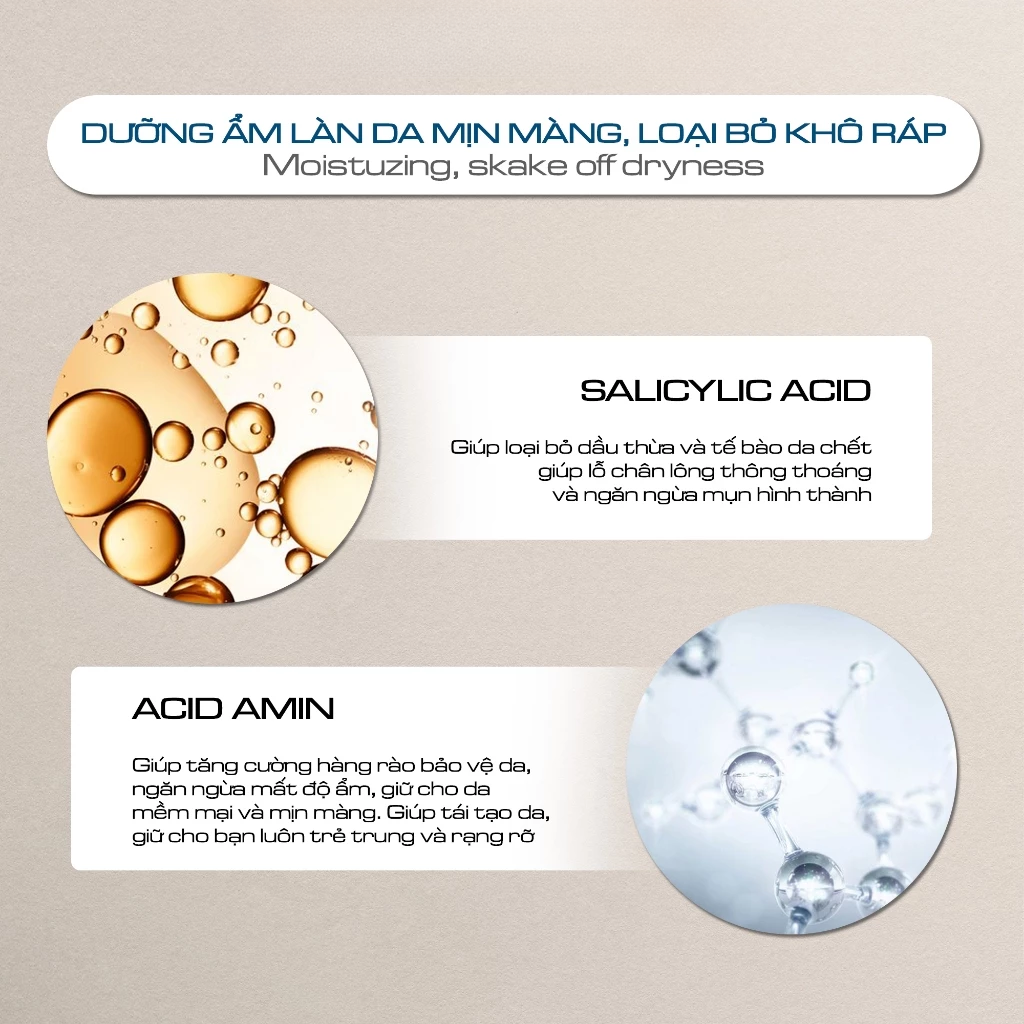 - Thành phần dưỡng ẩm : Sử dụng công nghệ SA Duo là sự kết hợp giữa Axit Salicylic và 5 axit amin ( Lysine, Histidine, Aspartic acid, Threonine, Glutamic acid ) giúp tăng cường quá trình dưỡng ẩm đồng thời giảm dầu thừa và tế bào da thừa một cách hiệu quả giúp da luôn tươi trẻ dạng rỡ