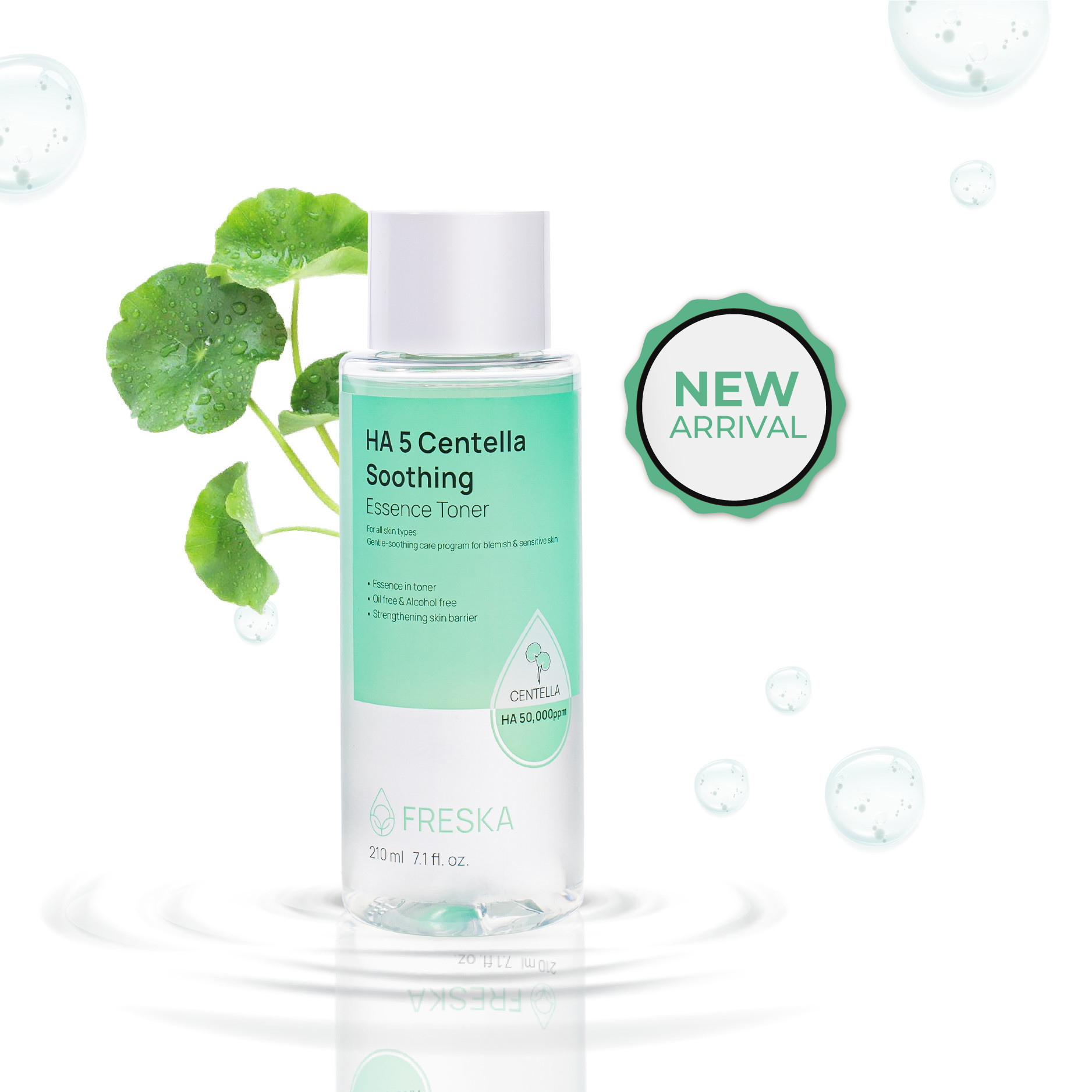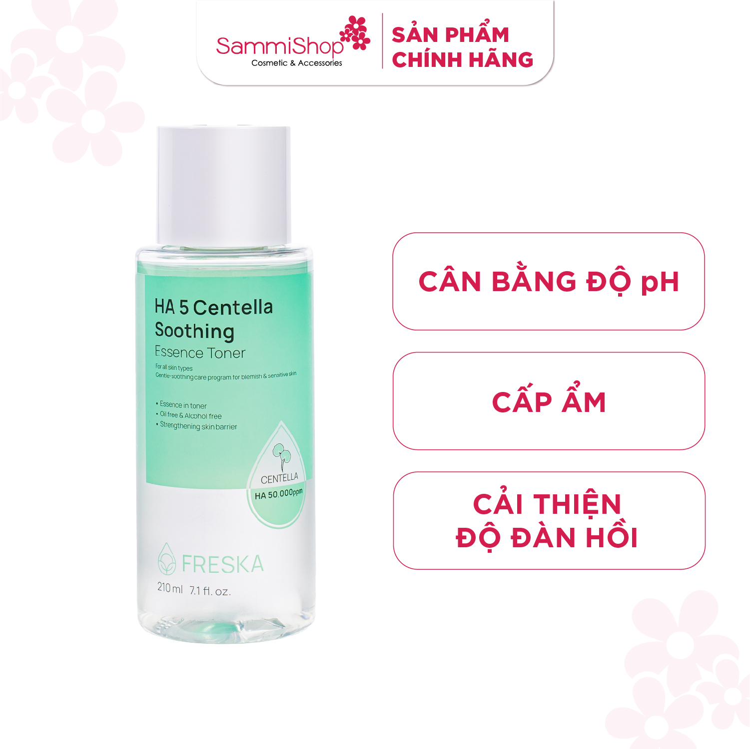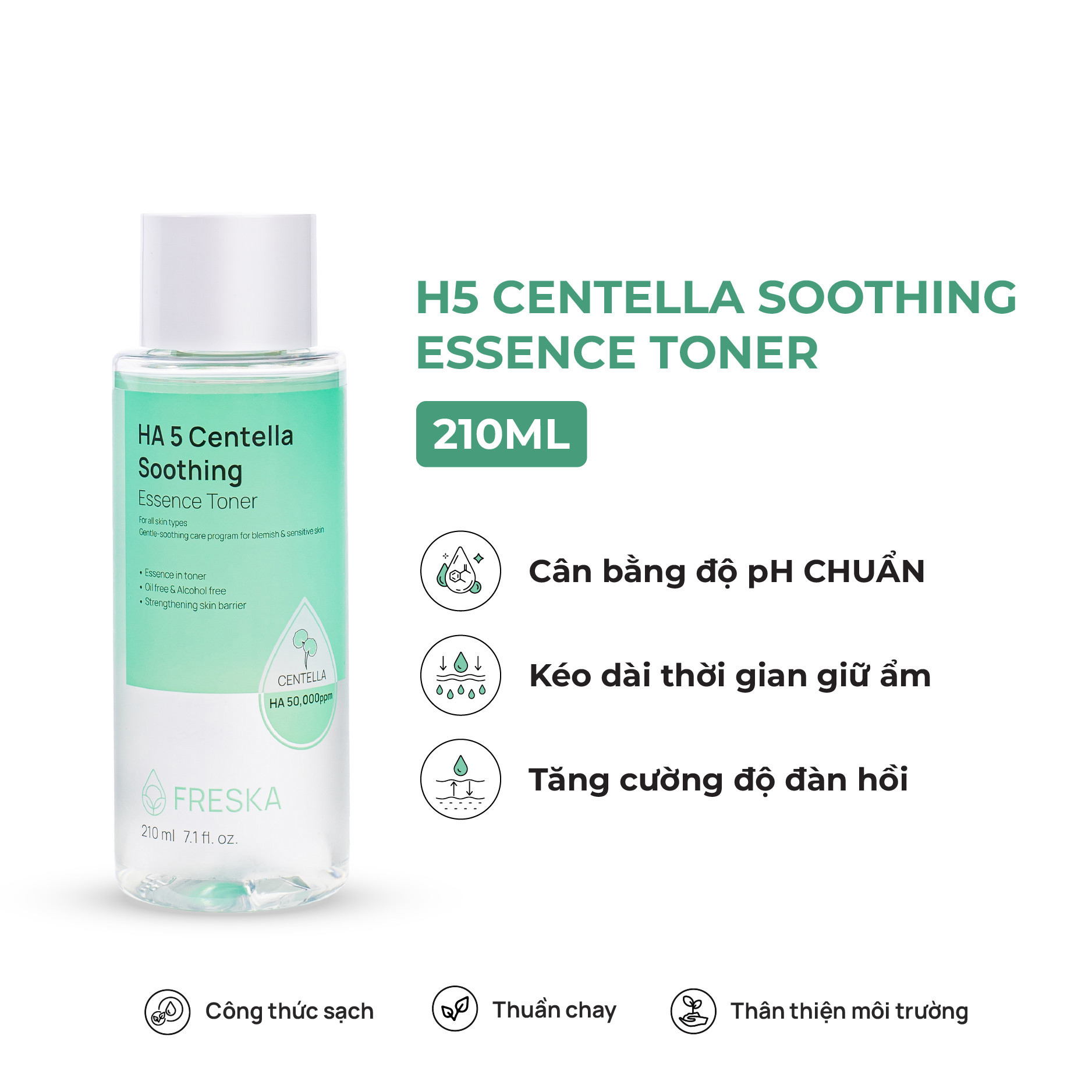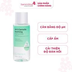 Nước hoa hồng Freska HA 5 Centella Soothing Essence Toner chứa thành phần chiết xuất lá rau má (Centella Asiatica Leaf Extract), 5% Sodium Hyaluronate (50,000ppm) và Panthenol giúp bổ sung độ ẩm, giúp làm mềm da, từ đó hỗ trợ các bước dưỡng sau thẩm thấu vào da tốt hơn.